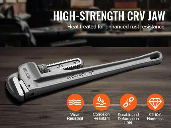 Durable Construction: The pipe wrench head is forged from CRV alloy with a hardness of 52HRC, and heat-treated jaws enhance wear resistance and deformation resistance, extending its lifespan.