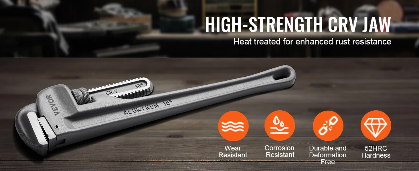 Chromium-vanadium steel provides excellent strength and hardness, resisting long-term wear and corrosion. Our aluminum pipe wrench performs reliably even in humid or harsh environments without rusting.