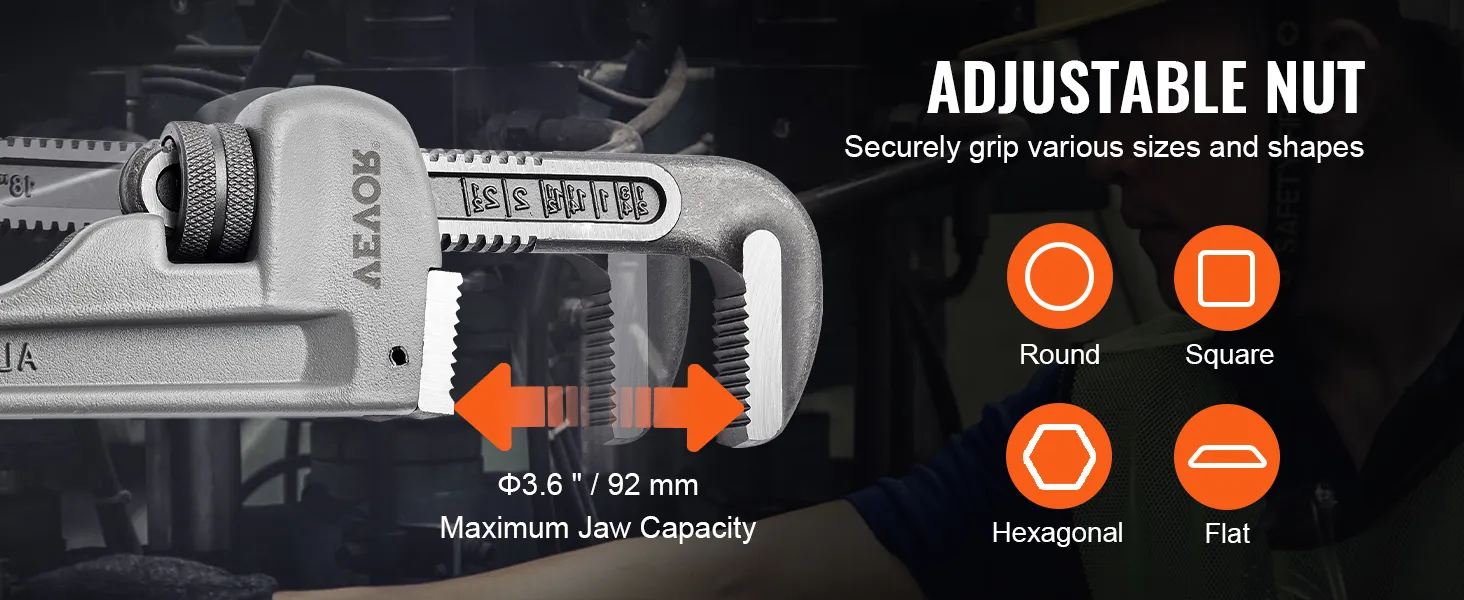 Featuring an adjustable nut design, our aluminum straight pipe wrench securely grips various sizes and shapes of components—whether fastening nuts, bolts, or other parts—with ease and stability.