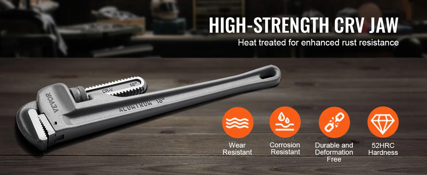 Chromium-vanadium steel provides excellent strength and hardness, resisting long-term wear and corrosion. Our aluminum pipe wrench performs reliably even in humid or harsh environments without rusting.