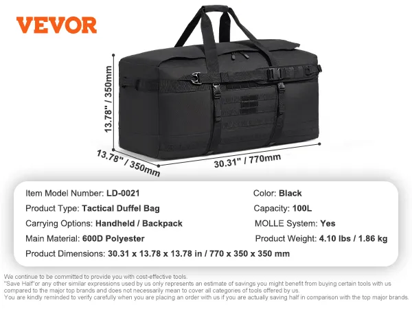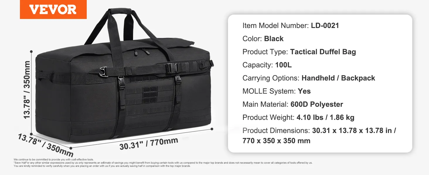 VEVOR Tactical Duffle Bag easily meets all your travel needs!