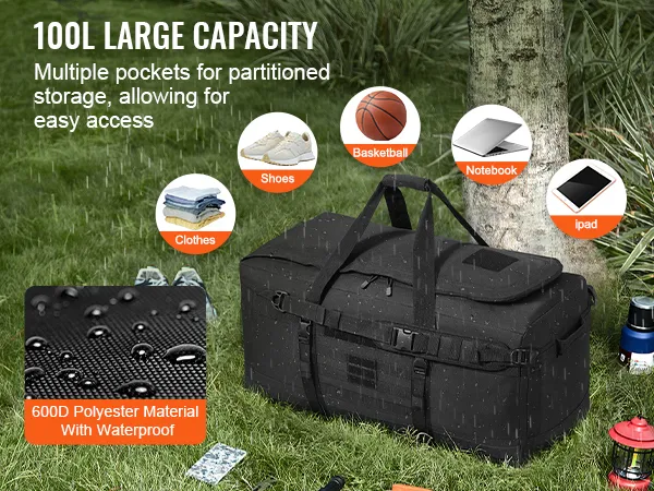 This tactical duffle bag can be used as a hand-carry bag or a shoulder bag, with a capacity of 100L. It can hold gym equipment, clothes, shoes, basketballs, and other items needed for sports and travel. Made from breathable, lightweight, waterproof, and scratch-resistant materials.