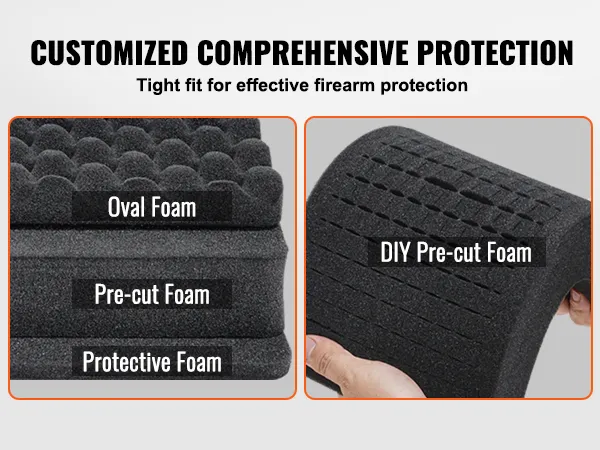 The upper cover of the hard gun case is lined with egg-shaped foam, with pre-cut foam for firearm placement, and the bottom layer includes protective foam to ensure a perfect fit with firearms and prevent damage and scratches due to improper sizing.