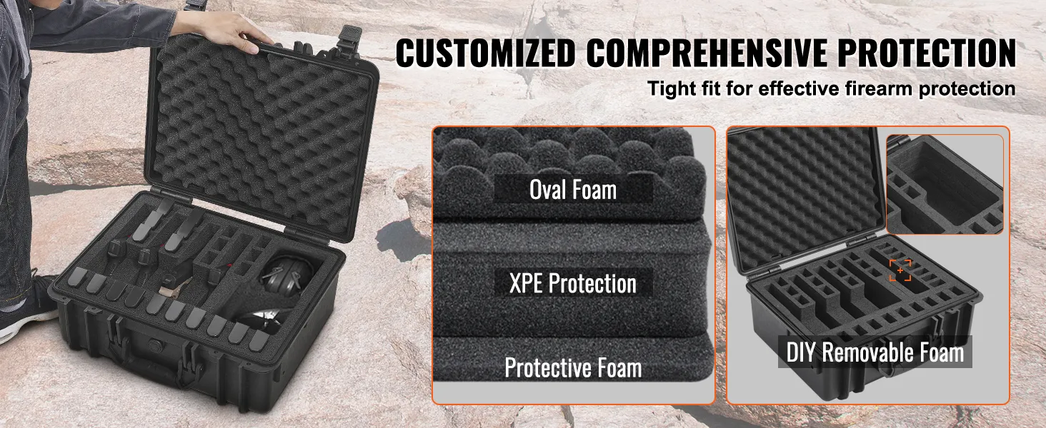 • Versatile XPE Module: To ensure a precise fit with handguns of various sizes, we've integrated height and length adjustable XPE modules. This feature ensures that even the smallest handguns fit snugly like full-sized ones, making it perfect for storing most handgun models and accessories such as goggles, holsters, gloves, and ammunition, offering an ideal storage and travel solution.
