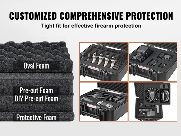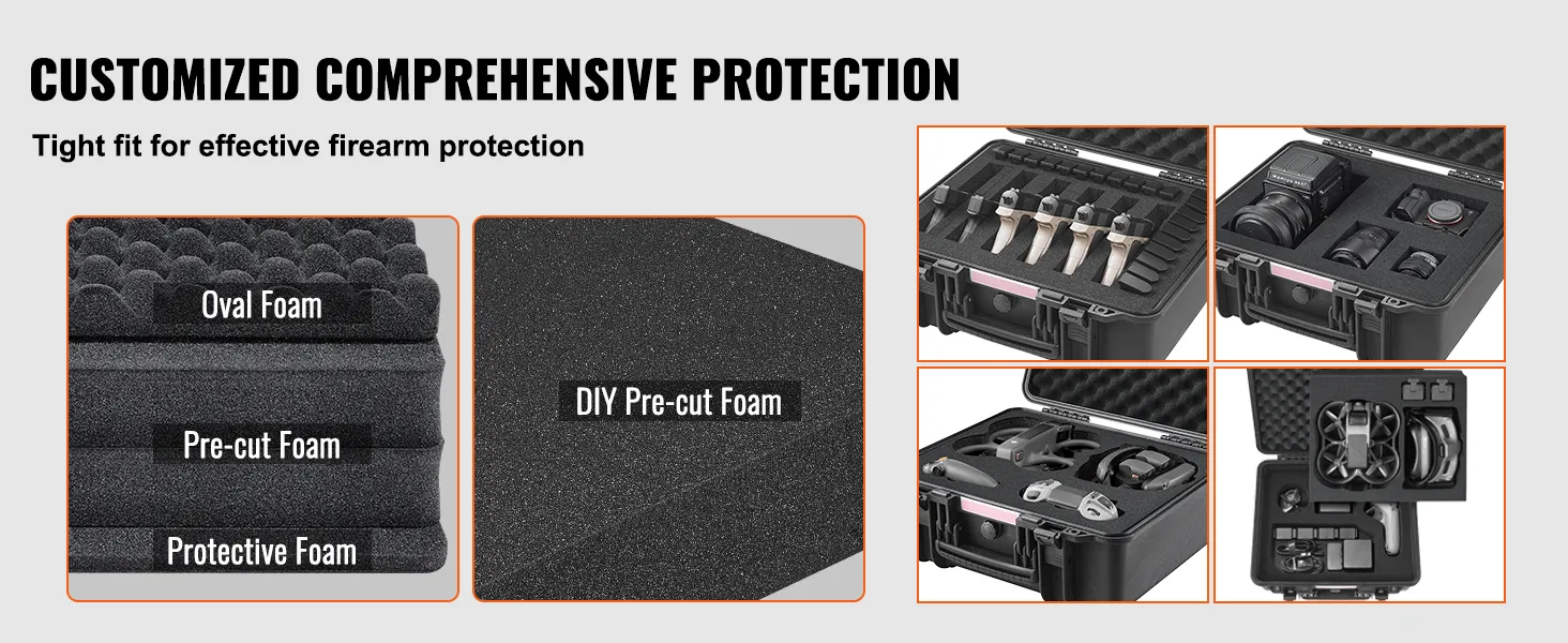 The upper cover of the hard gun case is lined with egg-shaped foam, with pre-cut foam for firearm placement, and the bottom layer includes protective foam to ensure a perfect fit with firearms and prevent damage and scratches due to improper sizing.
