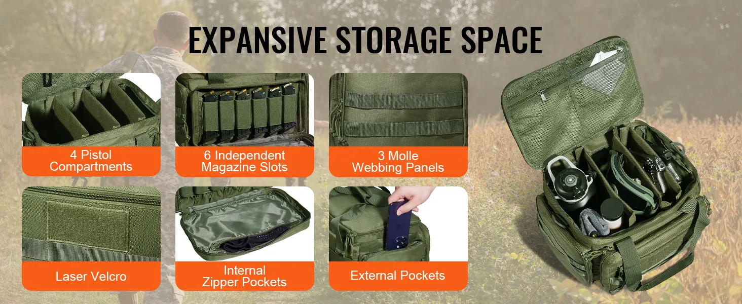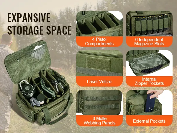 This gun range bag can hold up to 4 handguns and 6 magazines. It features 3 detachable Molle panels and 2 side pockets, which expand its storage capacity, allowing you to carry more gear and essentials.