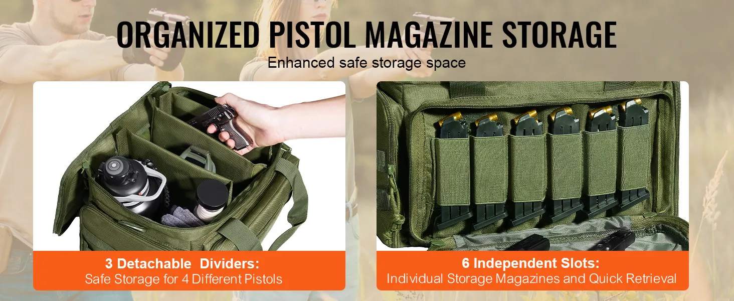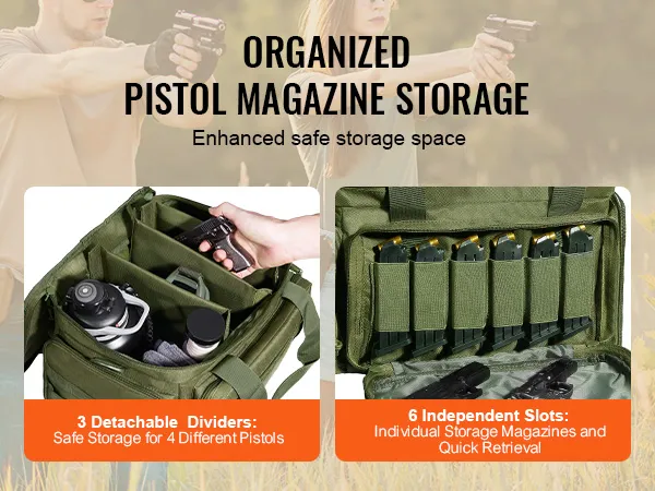 The spacious main compartment is equipped with 3 removable dividers, allowing you to categorize and store handguns of various sizes. The front pocket is designed to securely hold 6 magazines in sturdy slots, ensuring quick and easy access.