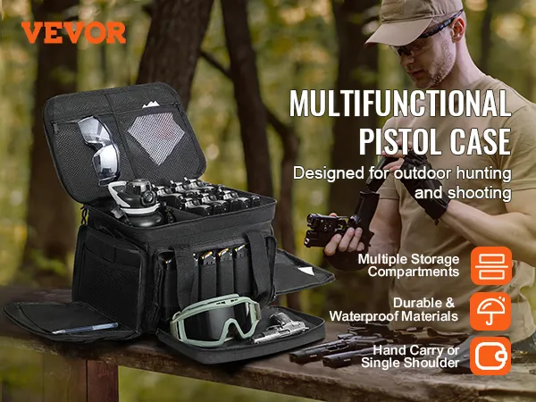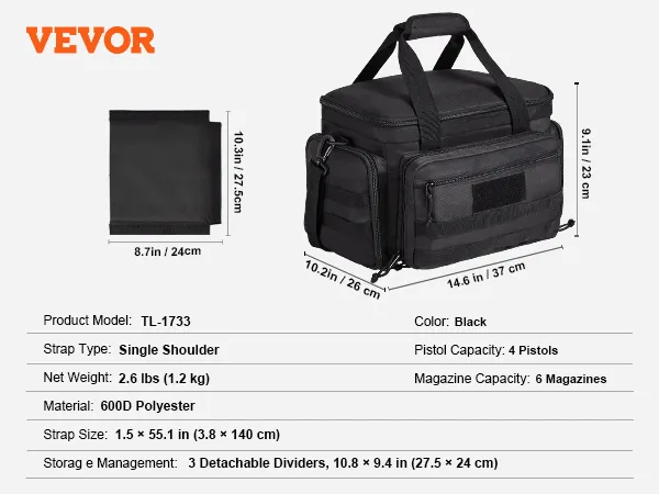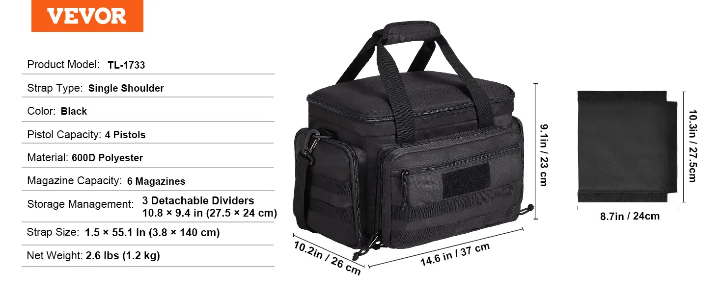 VEVOR Range Bag for 4 Pistols, Tactical Gun Range Bag with 3 Detachable Baffles & 6 Magazines, Firearm Shooting Handgun Bag for Outdoor Hunting Shooting Pistol Bag with Single Shoulder Strip, Black