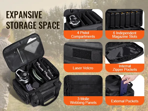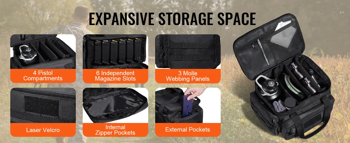 This gun range bag can hold up to 4 handguns and 6 magazines. It features 3 detachable Molle panels and 2 side pockets, which expand its storage capacity, allowing you to carry more gear and essentials.