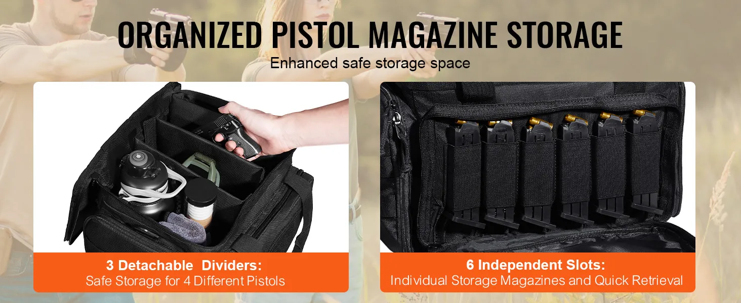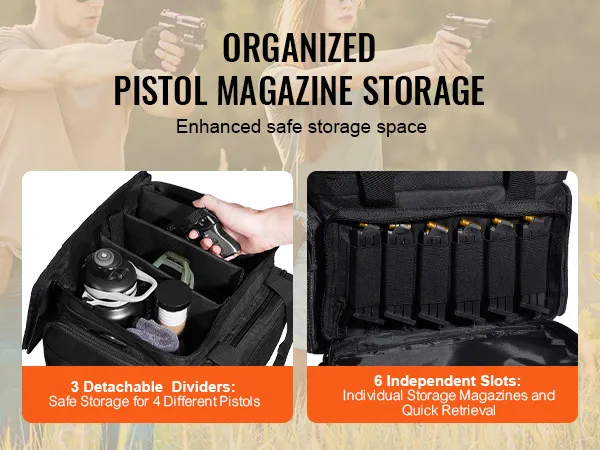 The spacious main compartment is equipped with 3 removable dividers, allowing you to categorize and store handguns of various sizes. The front pocket is designed to securely hold 6 magazines in sturdy slots, ensuring quick and easy access.
