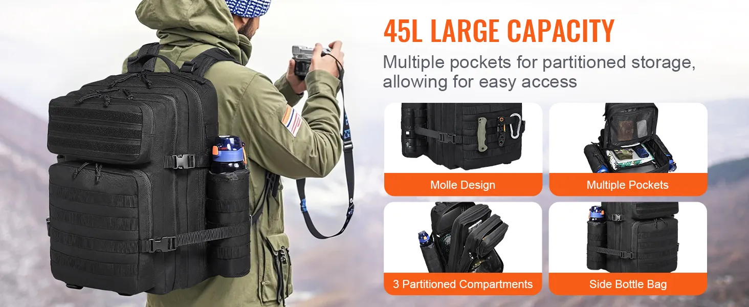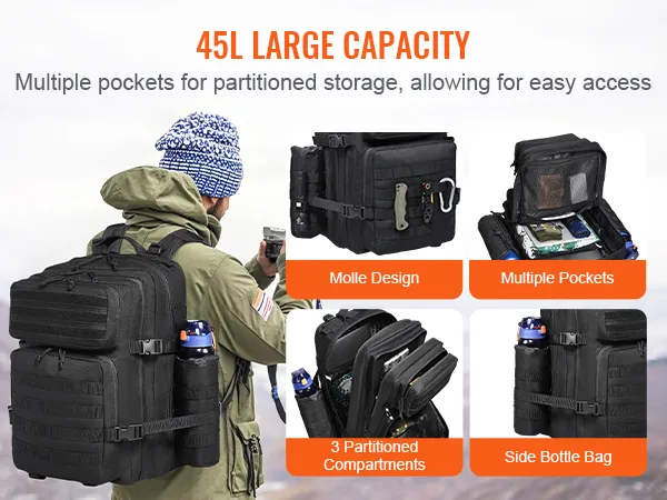 VEVOR Tactical Backpack, 45L Military Tactical Backpack with Molle Design & 3 Compartments, Army Assault Pack Bag for Men and Women, Range Gear Backpack for Outdoor Adventure, Hiking, Hunting, Black