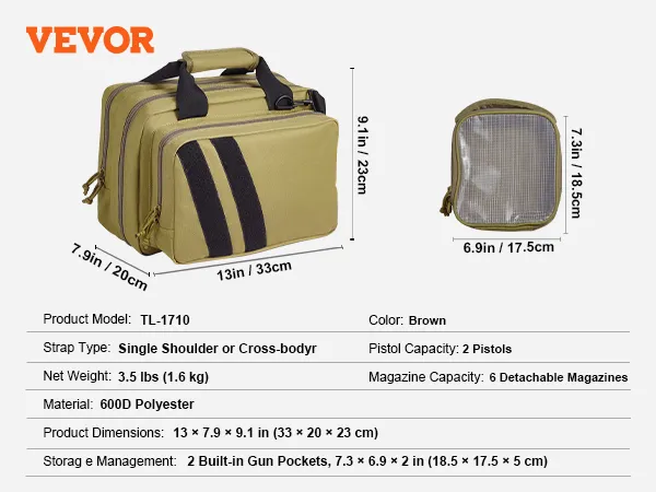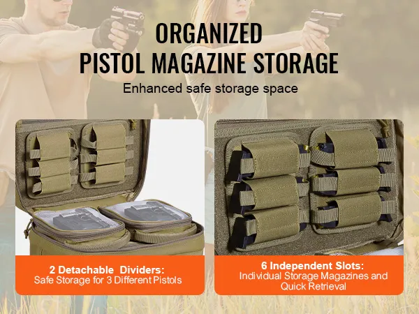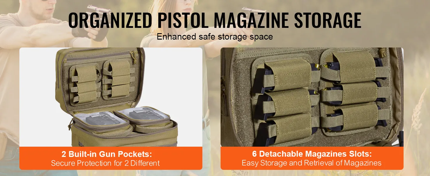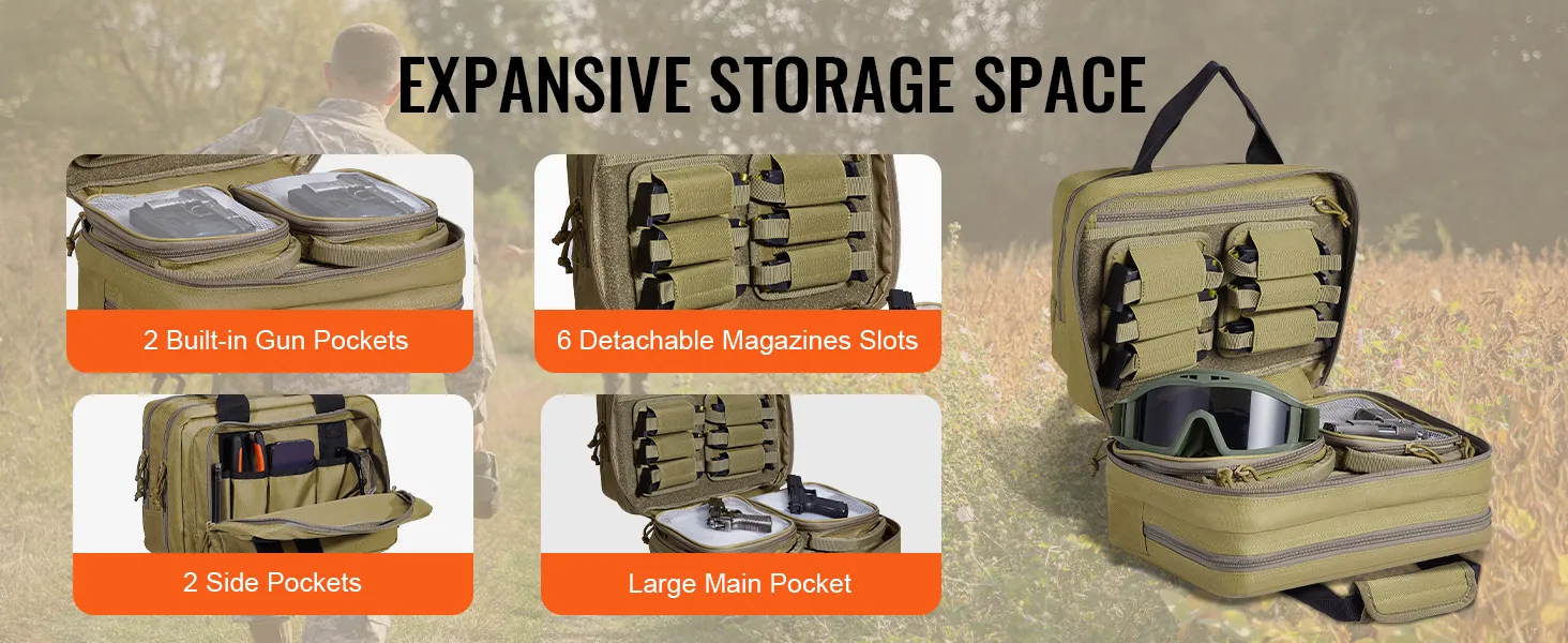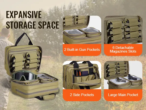 De pistooltas heeft 2 geïntegreerde pistoolvakken en 6 uitneembare magazijnvakken. Het hoofdcompartiment en de 2 extra compartimenten bieden plaats aan spullen zoals gehoorbescherming, veiligheidsbril, zaklamp, handschoenen, enz.
