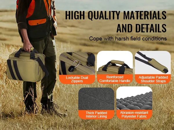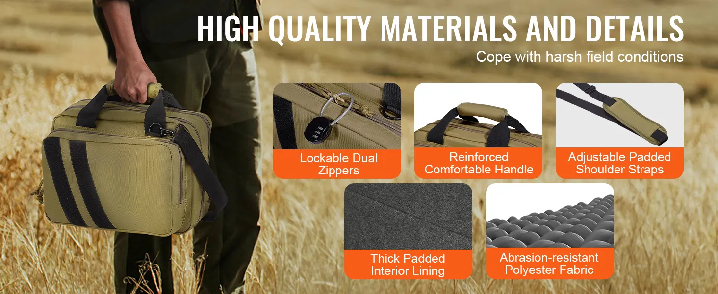 Het beschikt over dikke interne vulling om vuurwapens te beschermen tegen stoten en slijtage. Het beschikt over een stevige draaggreep, een verstelbare, gewatteerde schouderriem voor comfortabel dragen en afsluitbare ritsen voor veilig transport.