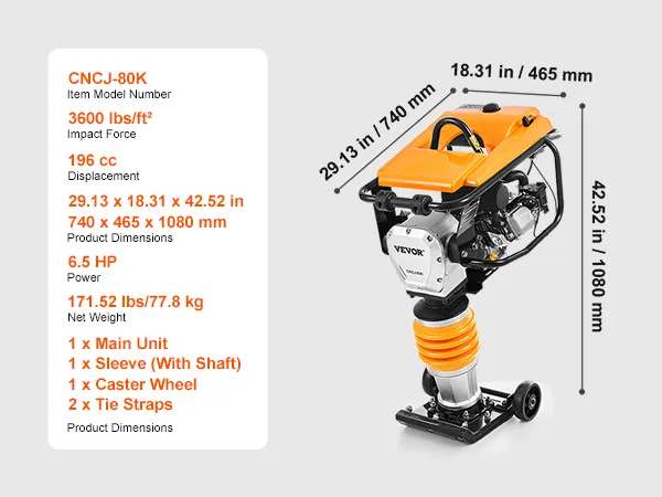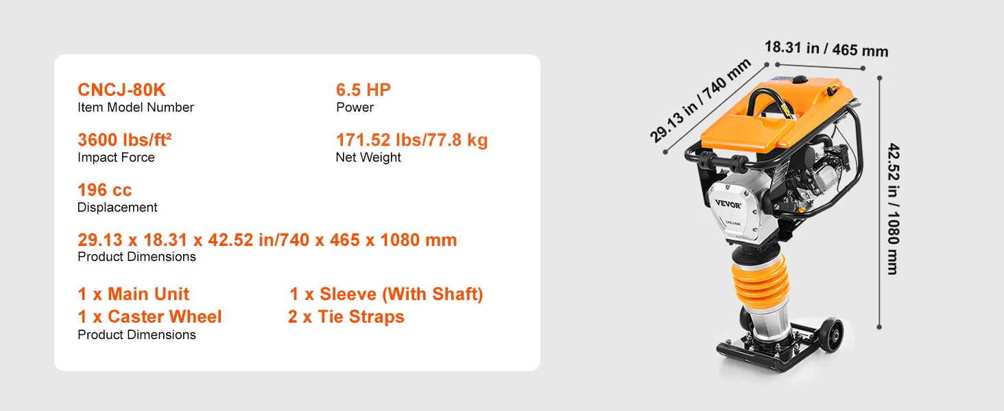 Equipped with a 6.5 HP engine and a striking 3500 lbs of impact force, this compactor easily handles various soil types for efficient compaction, meeting all your construction needs.
