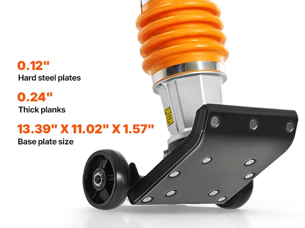 The vibratory tamper's base is made from 0.12" thick steel plate and 0.24" thick solid wood, providing strong impact resistance and a longer lifespan. The base dimensions are 13.39 x 11.02 x 1.57 inches (L x W x H), making it suitable for various construction environments and tasks.