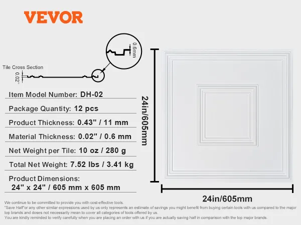 24” Ceiling Tiles: These square ceiling tiles measure 24”x24” with a geometric pattern, totaling 12 pieces to cover 48 square feet. Refresh your space with a clean, modern look.