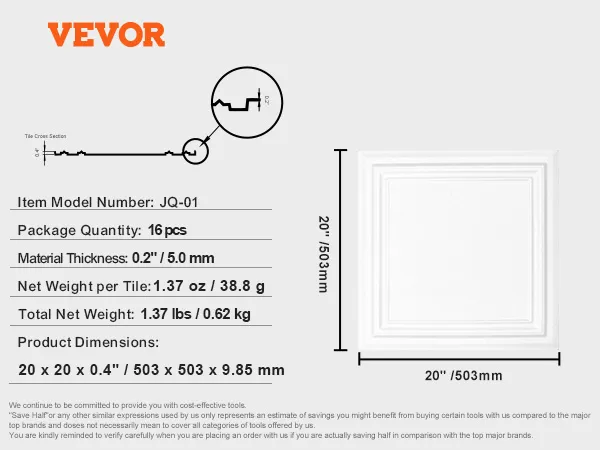 20” Ceiling Tiles: These square ceiling tiles measure 20”x20”, with a total of 16 pieces covering 44 square feet. Say goodbye to old, dirty ceilings and refresh your space.