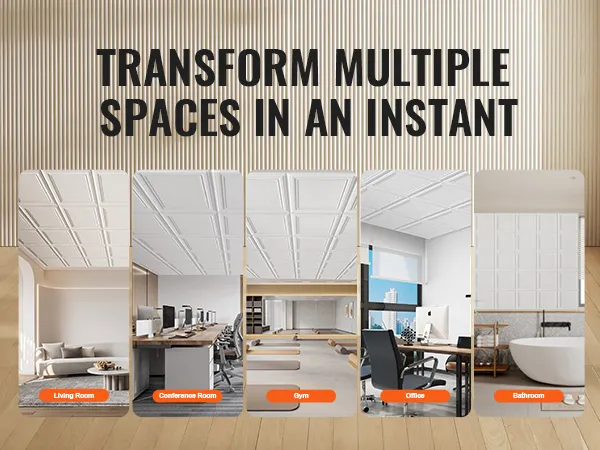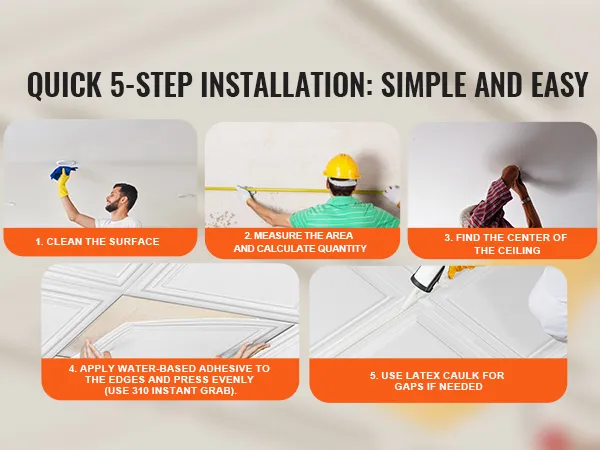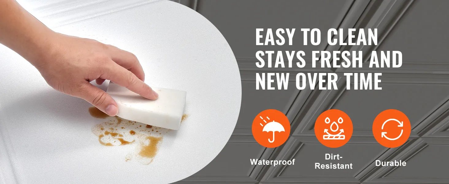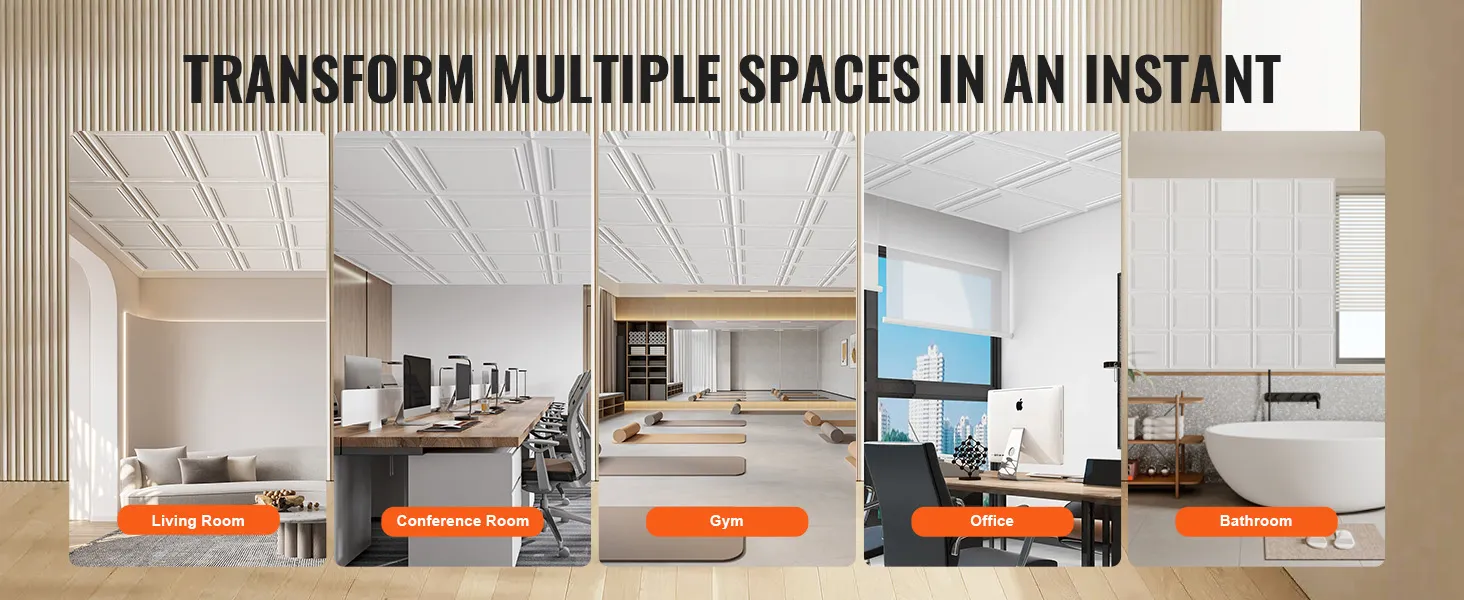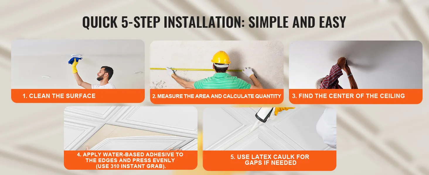 Premium PS: Made from high-quality PS material, these tiles are waterproof, stain-resistant, and lightweight. They easily adhere to most ceiling surfaces, including popcorn ceilings.