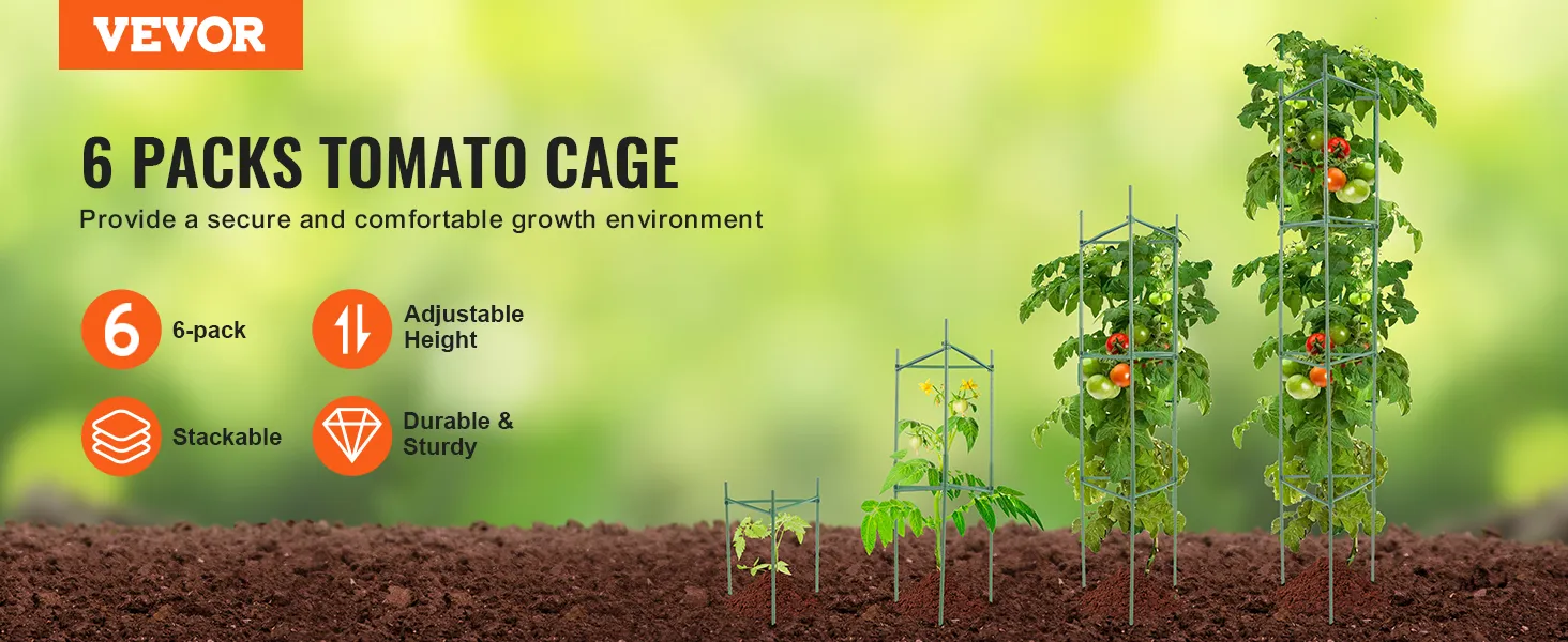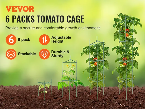 Deze tomatenkooi is stapelbaar en verstelbaar, zodat u de hoogte kunt aanpassen aan uw behoeften. Het is ideaal om planten in verschillende groeifasen te ondersteunen en biedt voldoende ruimte om zich te ontwikkelen.