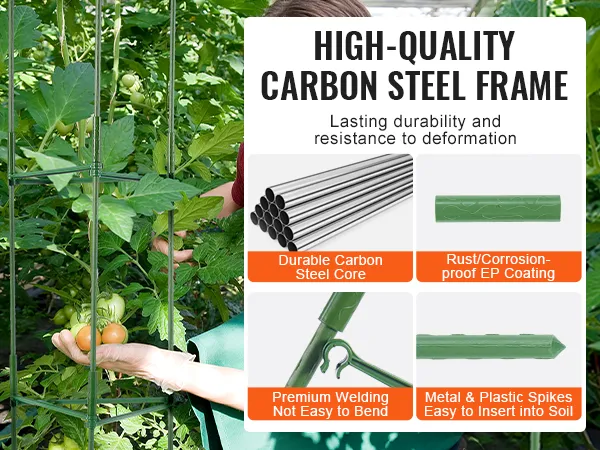 Deze plantensteunkooi is gemaakt van hoogwaardig koolstofstaal met poedercoating en is roestvrij en duurzaam. De stevige structuur zorgt voor betrouwbaarheid en houdt kleine dieren uit de buurt van uw planten.