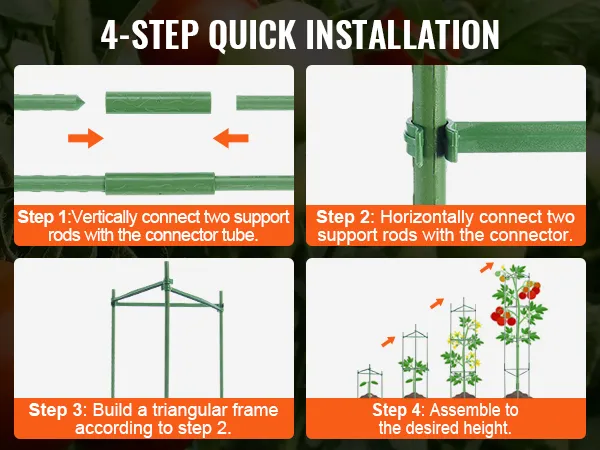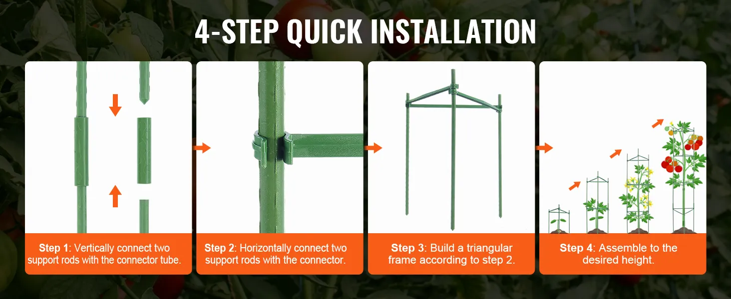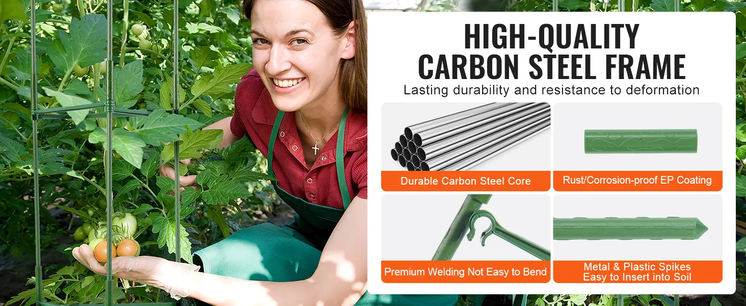 Eenvoudige installatie en opslag: eenvoudig en gemakkelijk te installeren: verbind de steunstangen met de meegeleverde accessoires. Wanneer u de tomatenkooi met tuinpalen niet gebruikt, kunt u deze eenvoudig demonteren en compact opbergen, waardoor u ruimte bespaart in uw magazijn.
