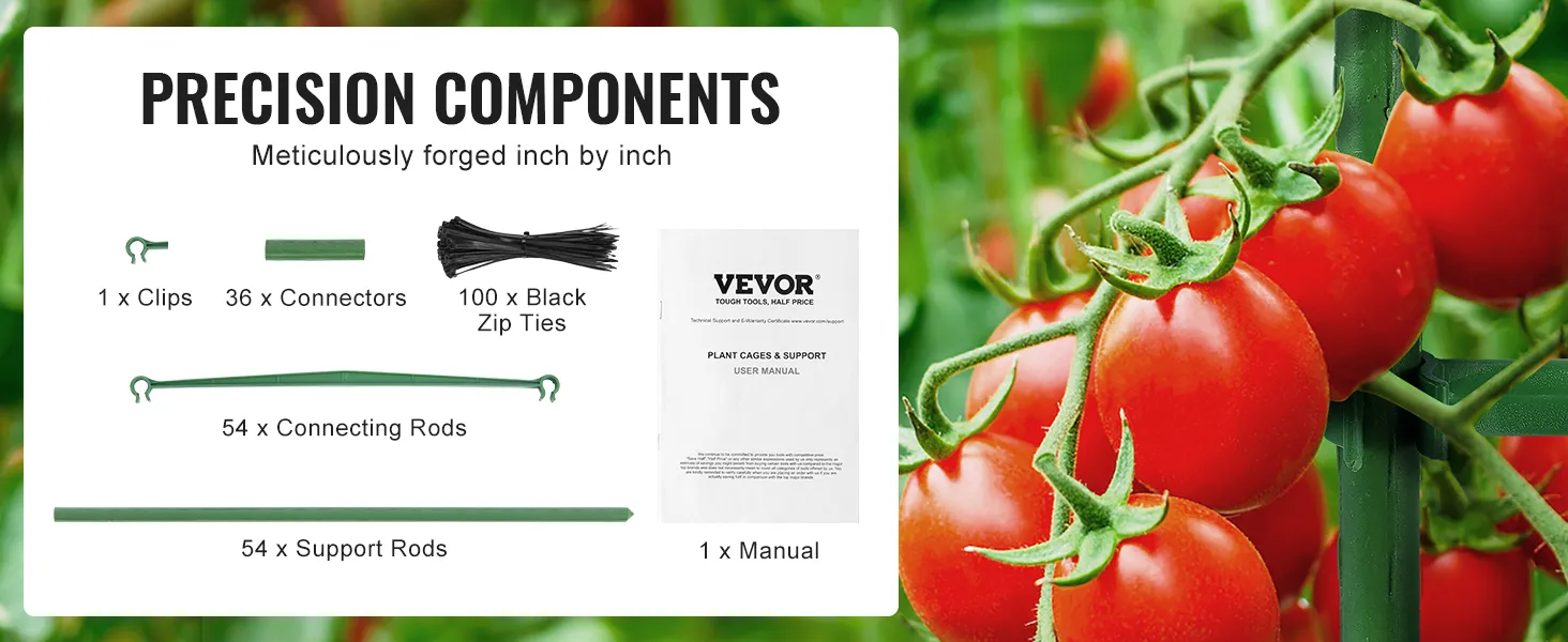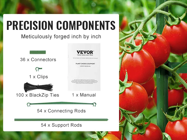 De tomatentorenset bestaat uit 54 drijfstangen, 54 steunstangen, 36 verbindingsbuizen, 1 clip, 100 zwarte kabelbinders en 1 handleiding. Elk onderdeel is zorgvuldig gesmeed om hardheid en corrosiebestendigheid te garanderen, waardoor een lange levensduur wordt gegarandeerd.