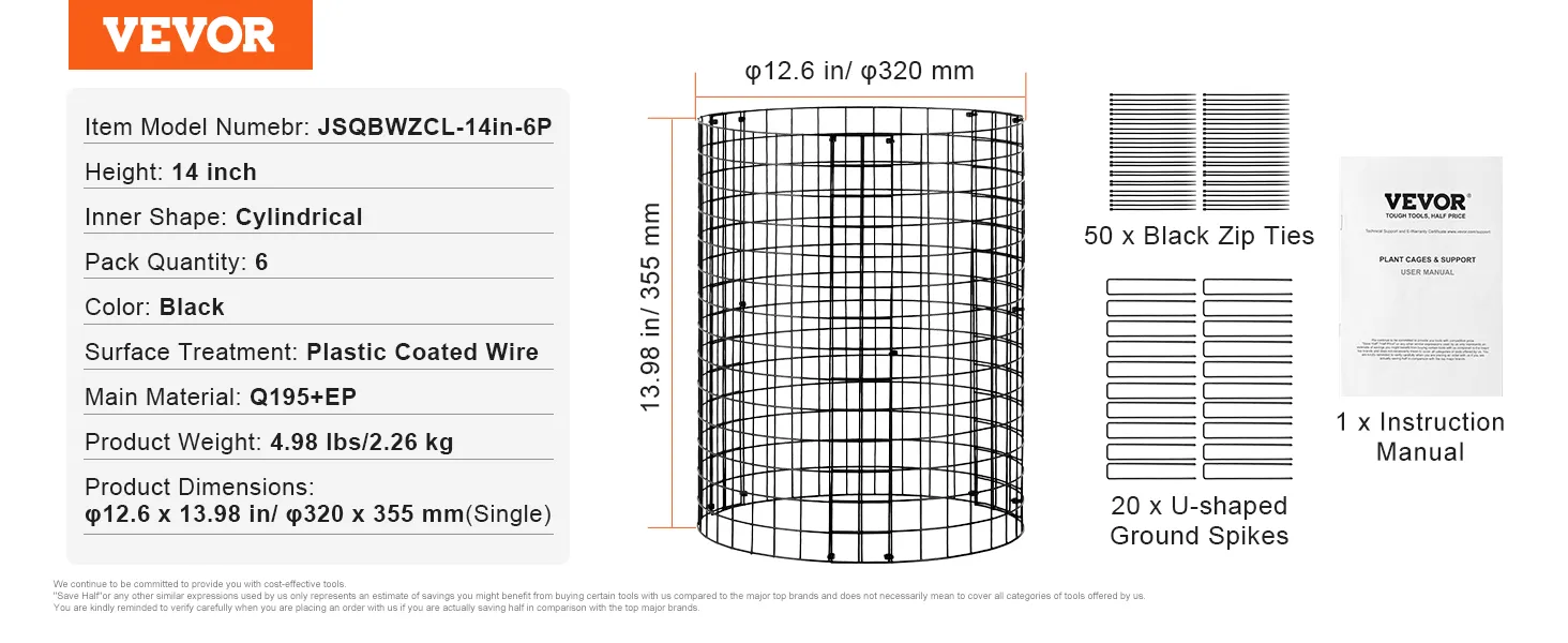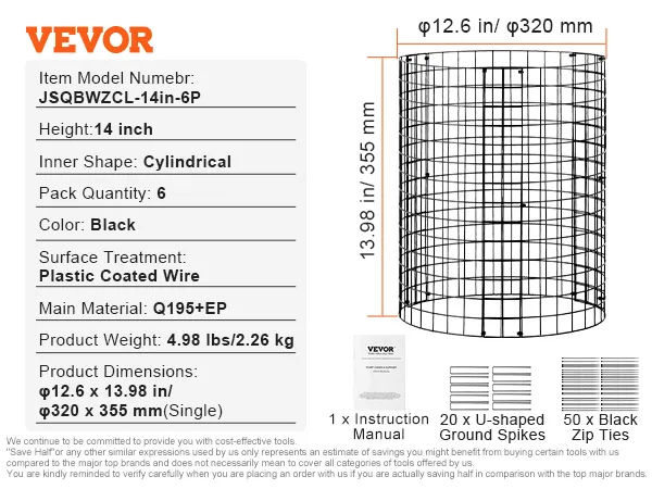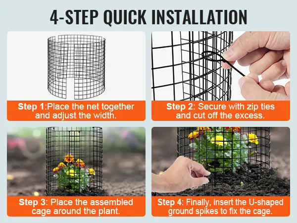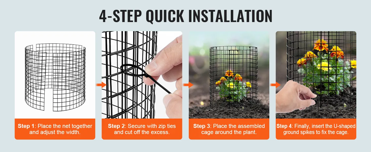 Eenvoudige installatie en opslag: eenvoudig en gemakkelijk te installeren: verbind de steunstangen met de meegeleverde accessoires. Wanneer u de draadplantenbeschermer niet gebruikt, kunt u deze eenvoudig demonteren en compact opbergen, waardoor u ruimte bespaart in uw magazijn.