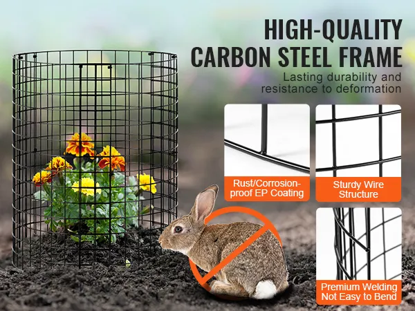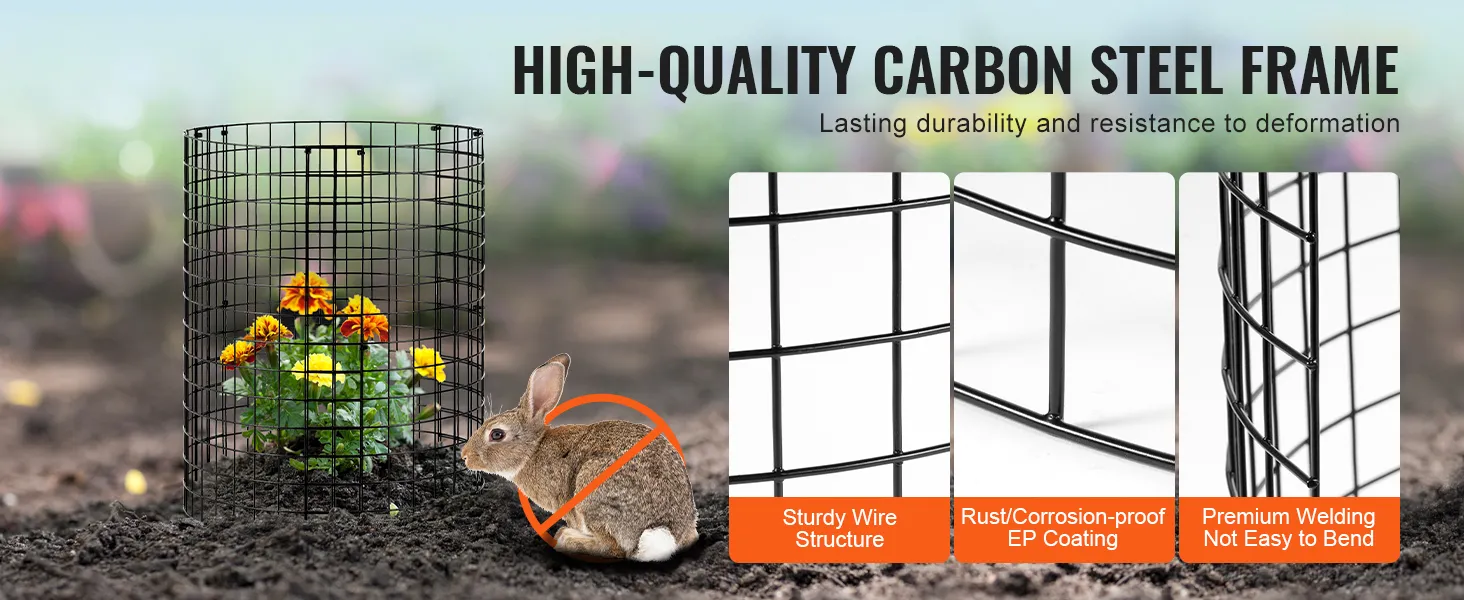 Gemaakt van hoogwaardig koolstofstaal met poedercoating, deze plantenbeschermer is roestvrij en duurzaam. De stevige structuur zorgt voor betrouwbaarheid en houdt kleine dieren uit de buurt van uw planten.