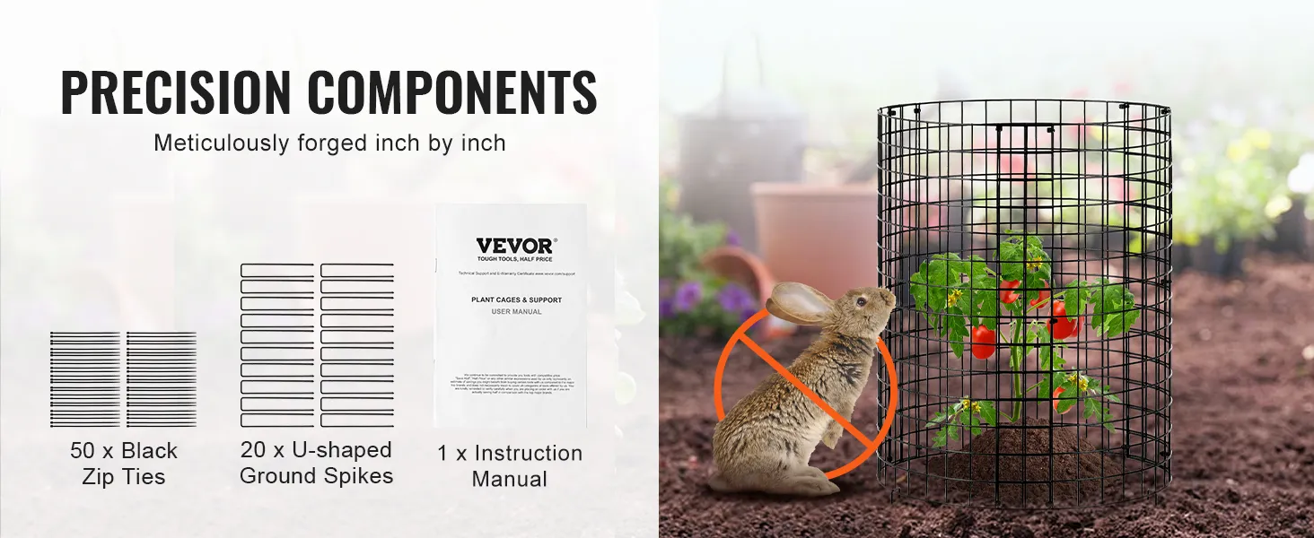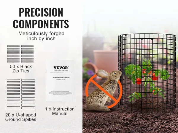 De plantenbeschermingsset van draadgaas bevat 18 metalen gazen, 50 zwarte kabelbinders, 20 U-vormige grondpennen en instructies. Elk onderdeel is zorgvuldig gesmeed om hardheid en corrosiebestendigheid te garanderen, waardoor een lange levensduur wordt gegarandeerd.