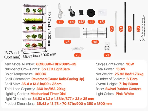 VEVOR plantenrek met kweeklampen, 6-laags plantenstandaard voor binnen met wielen en timer, 150W 3800K full spectrum licht, metalen bloemenrek voor zaaien, 90x35x180cm