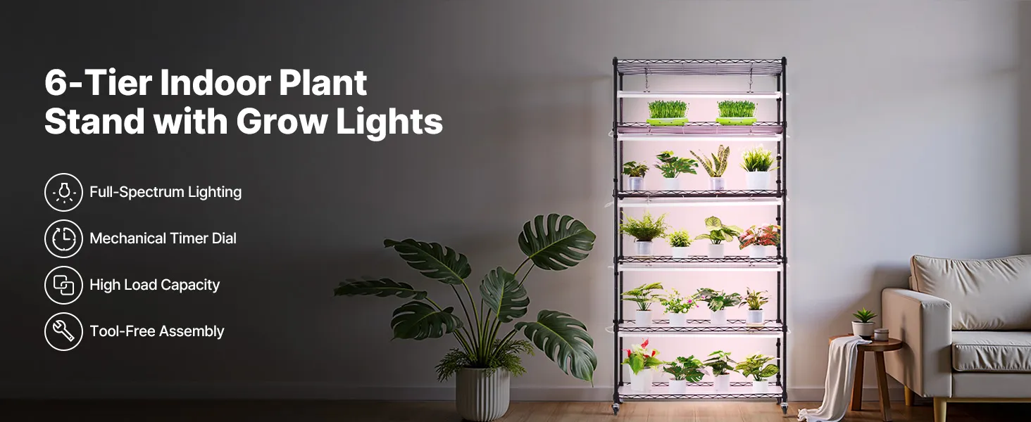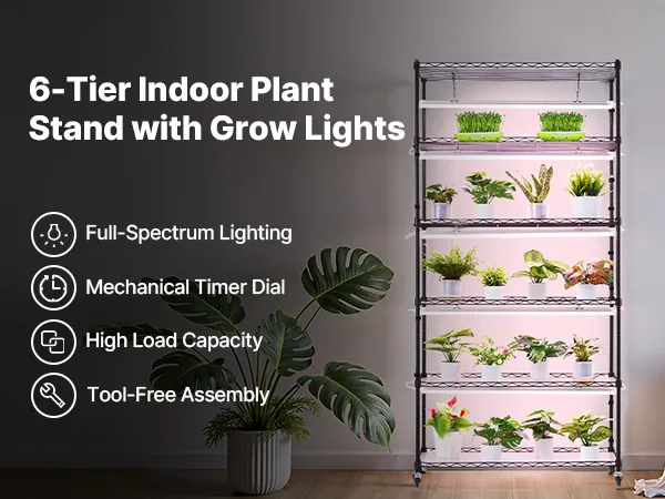Plantenstandaard met kweeklampen: Met een hoogte van 180 cm biedt deze plantenstandaard met 6 niveaus voldoende ruimte voor het kweken of tentoonstellen van kamerplanten. Hij is geschikt voor bloemen, zaailingen, microgroenten en groenten en creëert een ideale kweekomgeving zonder dat de planten naar buiten hoeven te worden gebracht voor zonlicht.