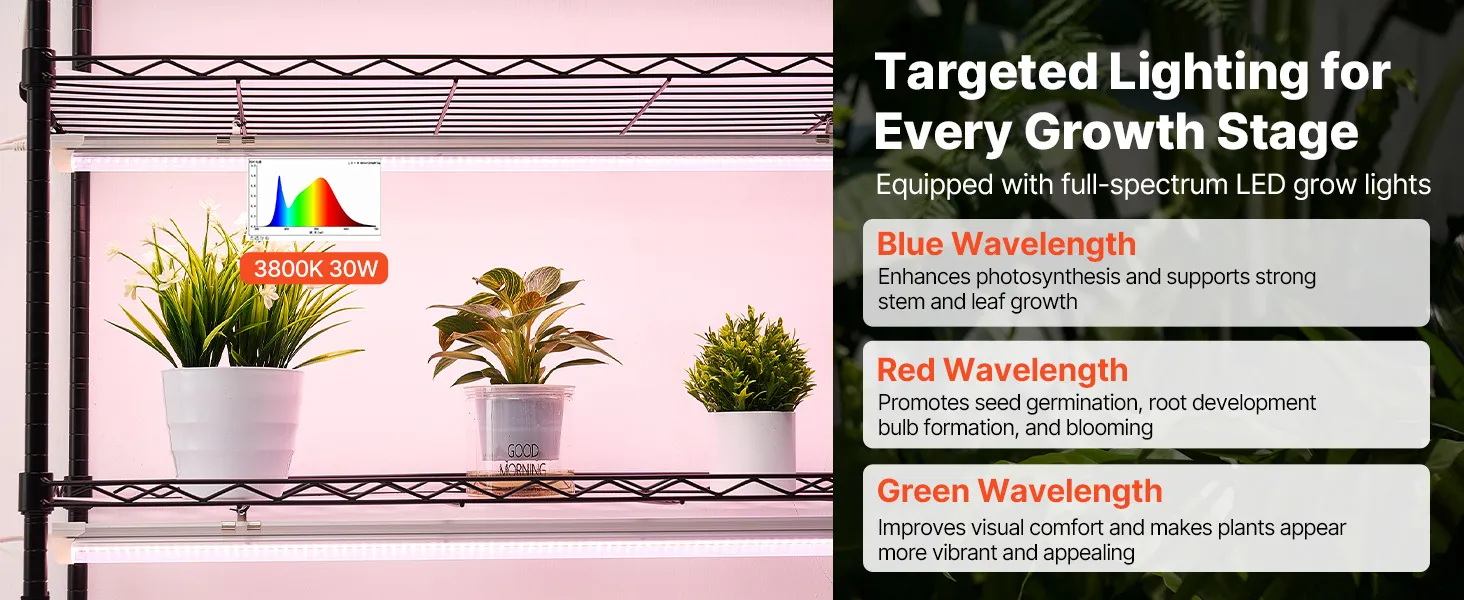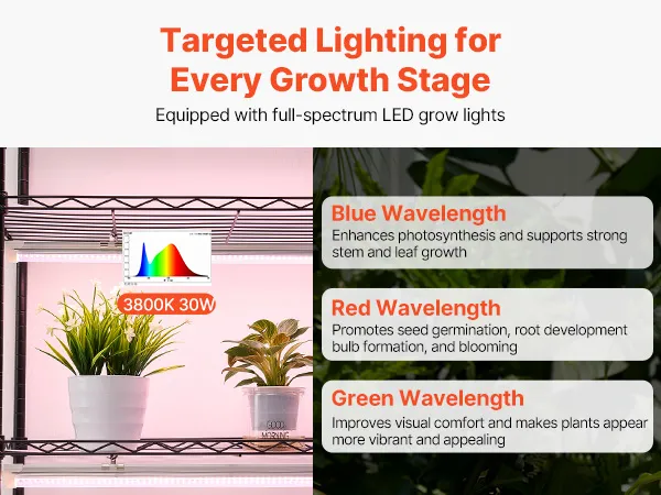 Full Spectrum LED-lampen: Uitgerust met 5 stuks 30W LED-kweeklampen biedt het verlichte plantenrek een hoge lichttransmissie en een brede dekking. Zo wordt in elke groeifase optimale verlichting geboden, wat een snellere en gezondere groei ondersteunt.