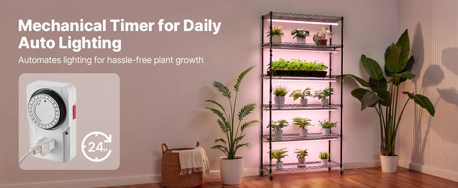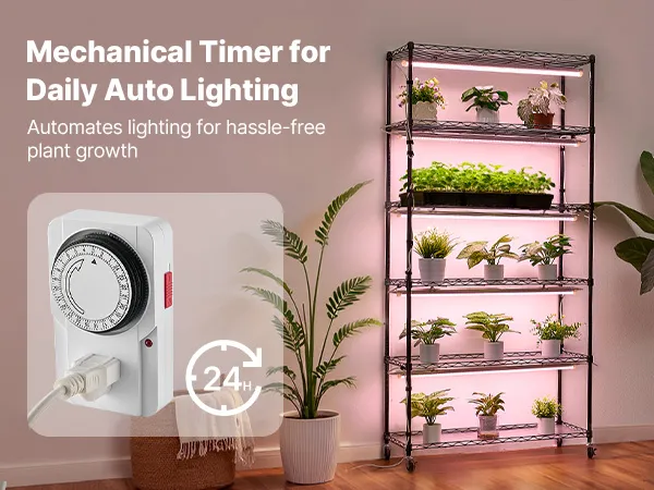Mechanische timer: De plantenstandaard met kweeklamp is voorzien van een ingebouwde, programmeerbare 24-uurs timer met intervallen van 15 minuten voor eenvoudige bediening. Eenmaal ingesteld, schakelt de timer dagelijks automatisch in en uit om ervoor te zorgen dat de planten consistente, energiezuinige lichtcycli krijgen.