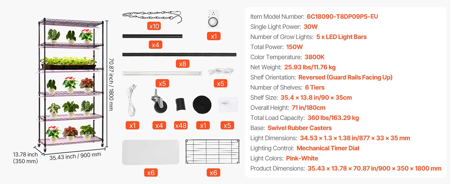 Het kweeklampenrek wordt geleverd met alle accessoires en duidelijke instructies. Geen gereedschap of ingewikkelde stappen nodig – snel opgezet en geniet van stressvrij binnentuinieren.