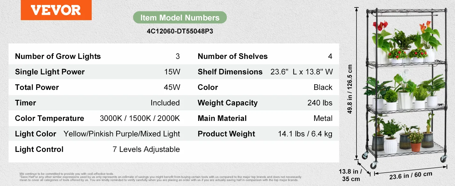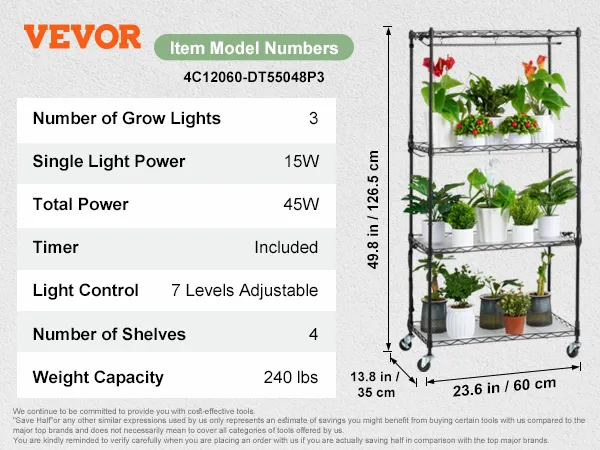 VEVOR plantenstandaard met kweeklamp, 4-laags 45W plantenrek voor binnen, 3 lichtspectrumstanden, metalen plantenrek met timer, plantengroeirek voor zaadkieming, 60 x 35 x 126,5 cm