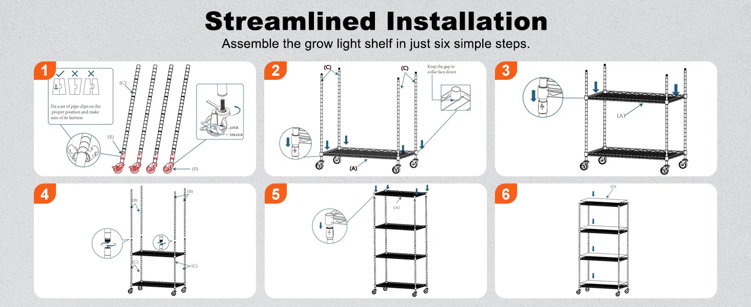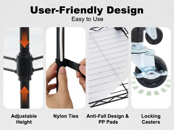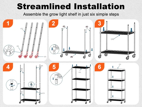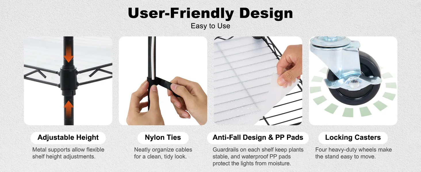 Praktisch en veilig ontwerp: het metalen plantenstandaardframe met verstelbare roosterhoogte is geschikt voor planten van verschillende afmetingen. De vier stevige industriële wielen maken het verplaatsen van het frame eenvoudiger. Het lekvrije ontwerp van de PP-mat beschermt de lampen tegen waterschade en zorgt voor een zorgeloze ervaring.