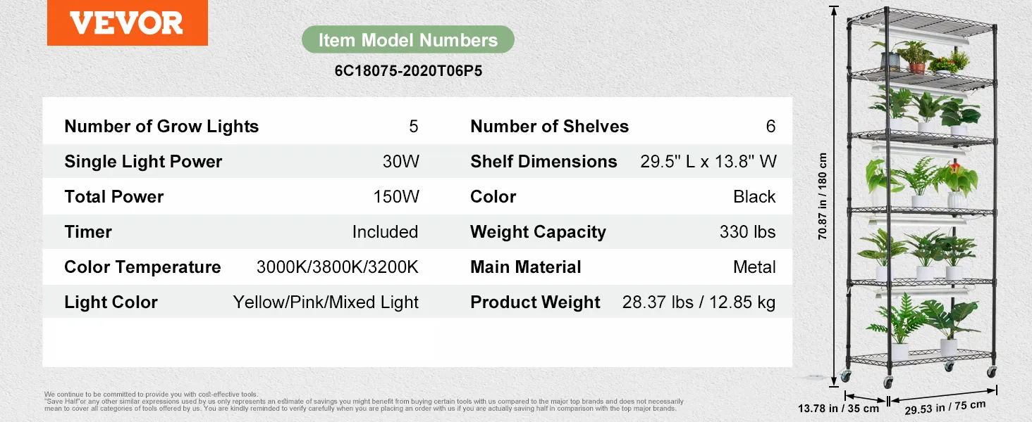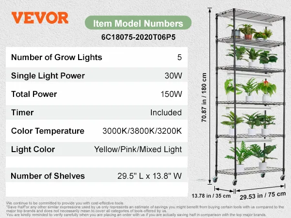 VEVOR plantenstandaard met kweeklamp, 6-laags 150W plantenrek voor binnen, 3 lichtspectrumstanden, stalen plantenrek met timer, kweekrek voor tuinplanten, 75x35x180cm