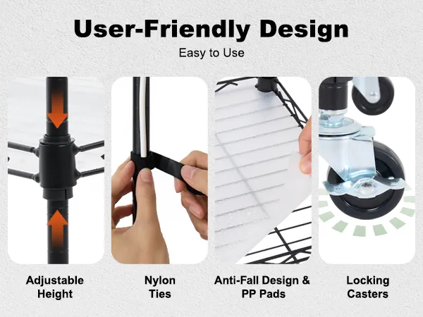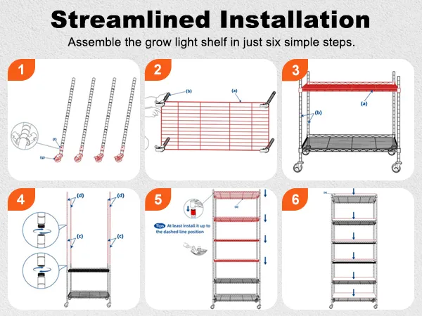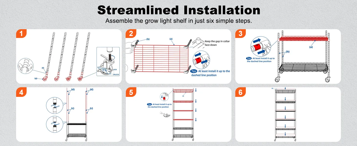 Praktisch en veilig ontwerp: het metalen plantenstandaardframe met verstelbare roosterhoogte is geschikt voor planten van verschillende afmetingen. De vier stevige industriële wielen maken het verplaatsen van het frame eenvoudiger. Het lekvrije ontwerp van de PP-mat beschermt de lampen tegen waterschade en zorgt voor een zorgeloze ervaring.
