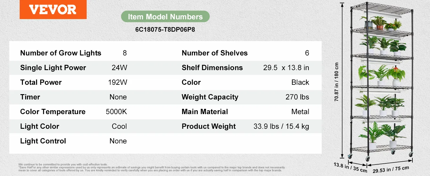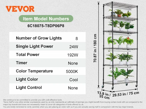 This DIY plant rack features 192W LED panels with a 400-780nm full-spectrum design. Made from high-density steel for rust and oxidation resistance, the 6 shelves plant holder measures 29.5 x 13.8 x 70.9 in. The plant rack with weight capacity of 270 lbs offers ample space and support for plants.