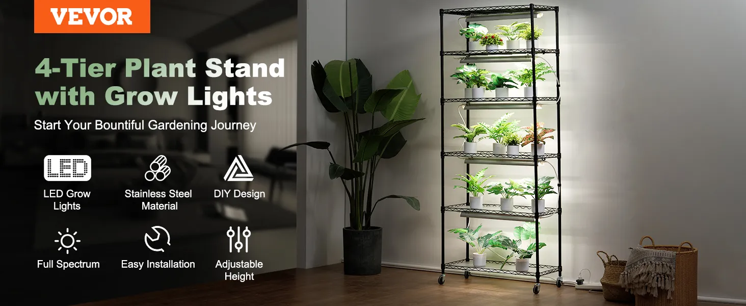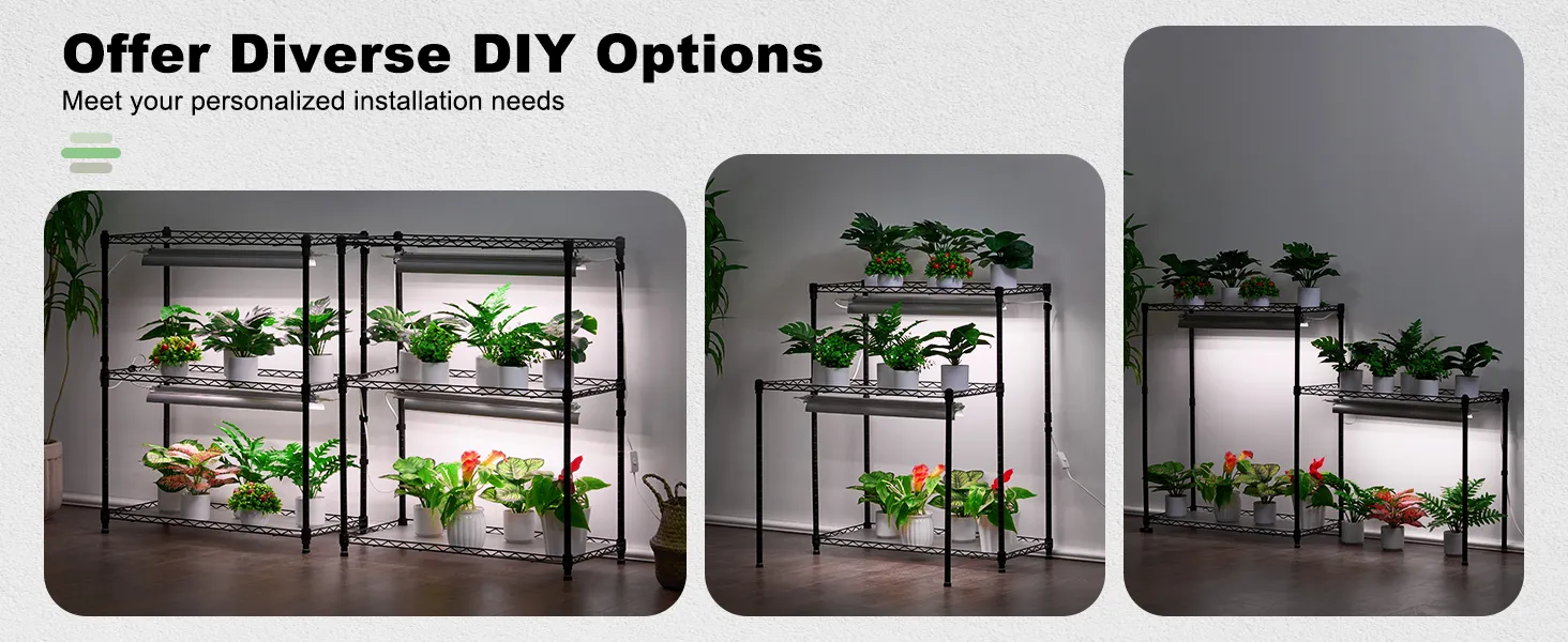 Flexible DIY Configuration: This plant stand with grow light offers various customizable setups to fit different space sizes, with up to six shelves, each measuring 29.5 x 13.8 inches. It supports a total weight of 270 lbs, and the adjustable wire rack height allows you to tailor the rack to your needs.