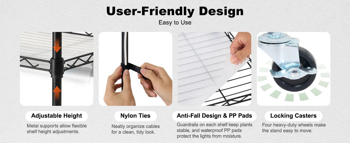 Secure Design: The plant grow shelf comes with PP mat that is leak-proof and drip-proof, protecting the lights from water damage. The anti-fall design prevents plants from tipping over, ensuring a secure setup.