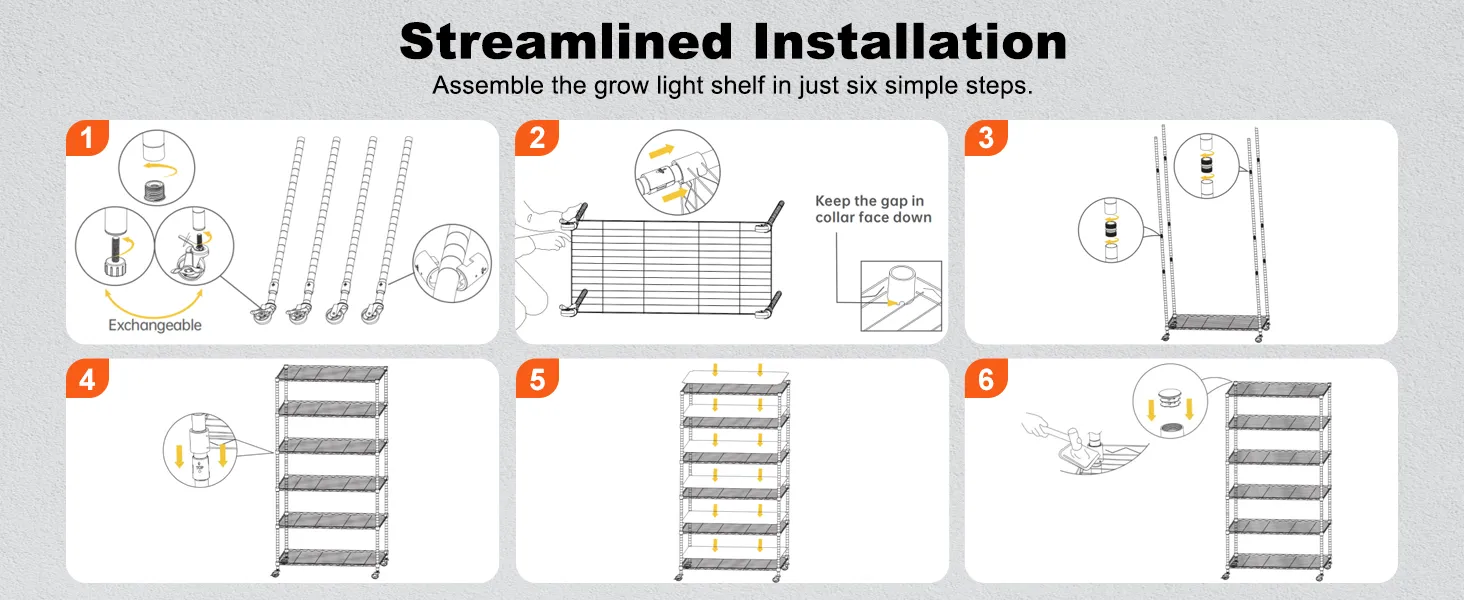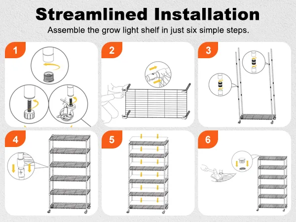 Easy Assembly: Our plant shelf with grow light features an optimized component connection structure with cylindrical guides and notches for precise assembly. The simplified assembly process enables quick and easy setup by a single person.