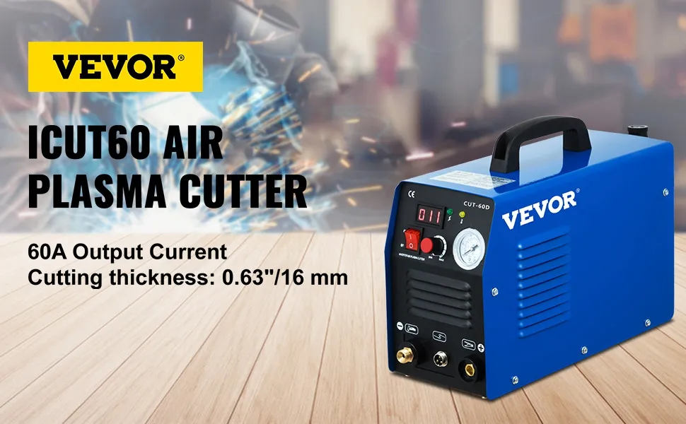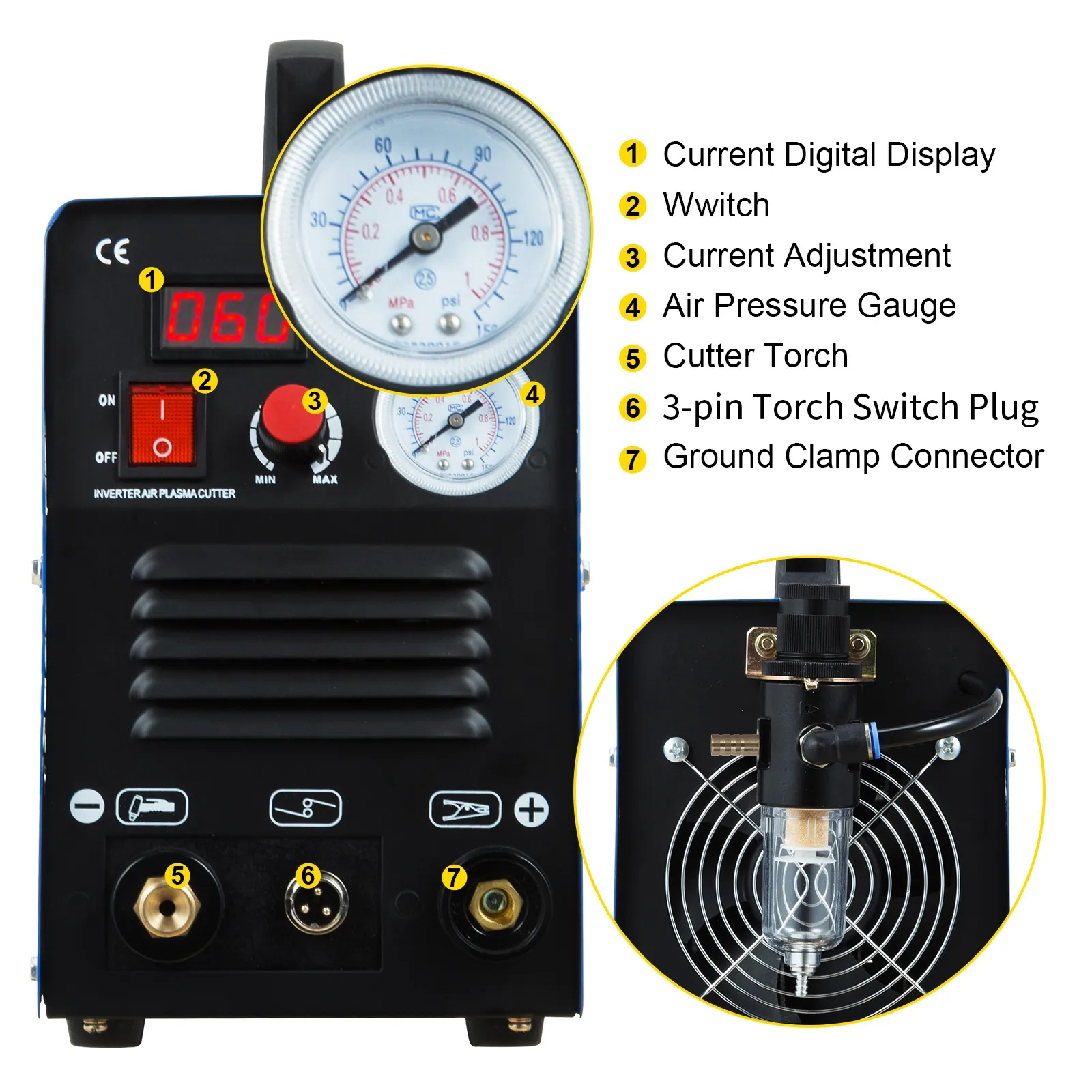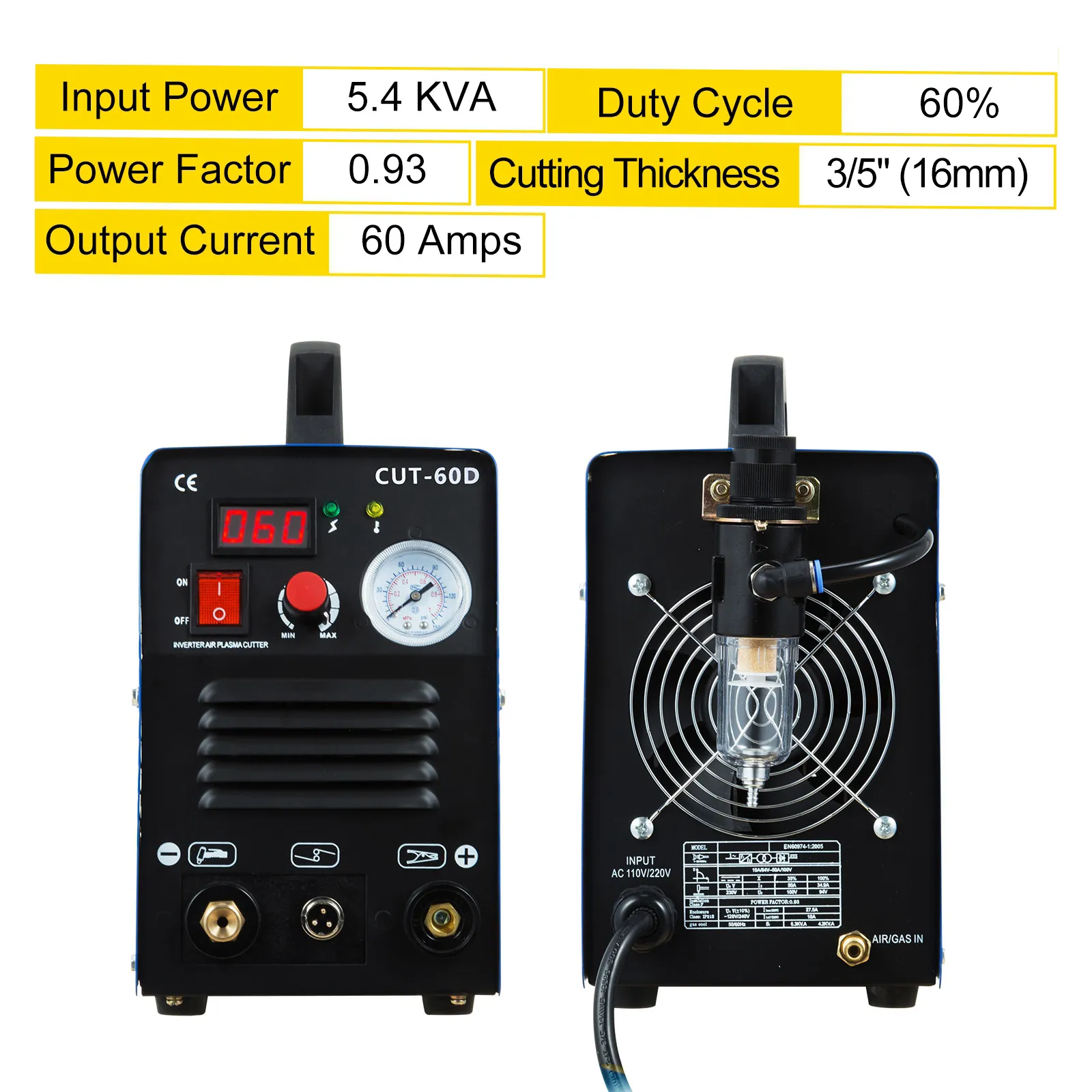 Uitgang & vermogen: AC 110/220V; Nominale uitgangsstroom: 60 ampère; max. snijdikte: 16 mm; De plasmasnijder met inverter is geschikt voor het snijden van roestvrij staal, gelegeerd staal, zacht staal, koper, aluminium, enz. Dankzij de dubbele spanning kan de plasmasnijder werken op 110V of 220V.