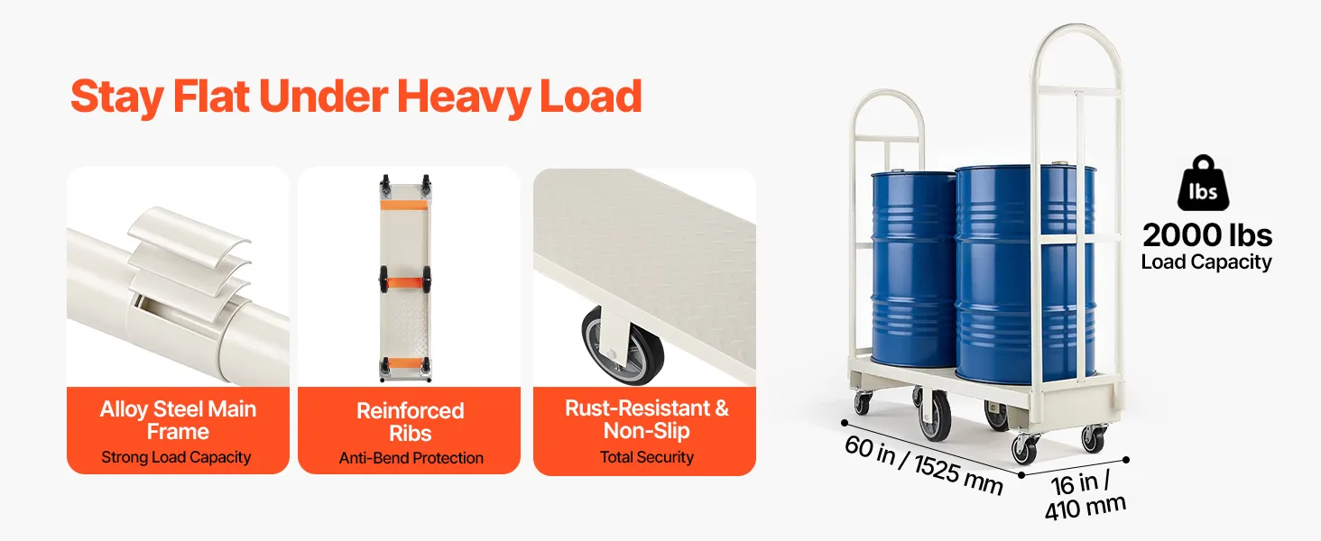 Deze robuuste transportwagen is voorzien van een versterkt frame van gelegeerd staal en een dikke bodemplaat, waardoor hij uitzonderlijk duurzaam is. Zelfs bij herhaaldelijk zwaar gebruik is hij bestand tegen buigen, vervorming en slijtage op lange termijn.