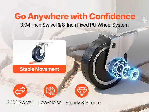 Soepel rollende nylon wielen: Deze platte trolley is ontworpen voor een stille en stabiele werking en is voorzien van twee 8-inch massieve rubberen wielen (vast) en vier 3,94-inch PU-zwenkwielen. De 360° zwenkwielen maken moeiteloos manoeuvreren mogelijk en zorgen voor een soepel transport van de lading.
