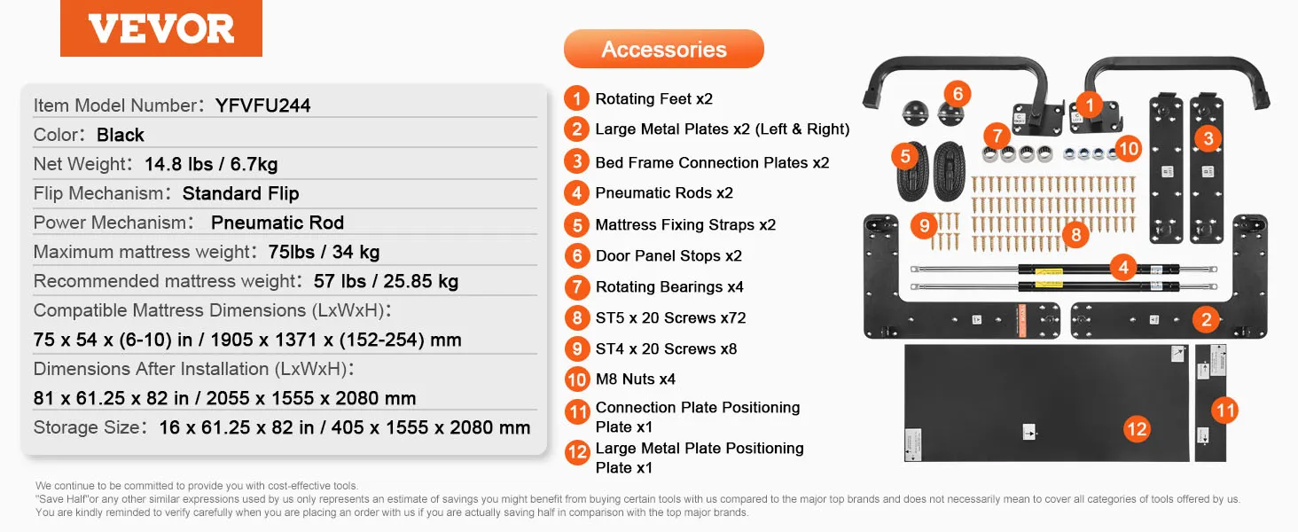 Productspecificaties: Ontworpen voor verticale QUEEN-matrassen, afmetingen: 81 x 61,25 x 82 inch / 2055 x 1555 x 2080 mm, geschikt voor matrassen van 75 x 54 x (6-10) inch / 1905 x 1371 x (152 – 254) mm . De draairichting is rechtop, waardoor u gemakkelijk toegang heeft en de verticale ruimte in uw slaapkamer maximaliseert.