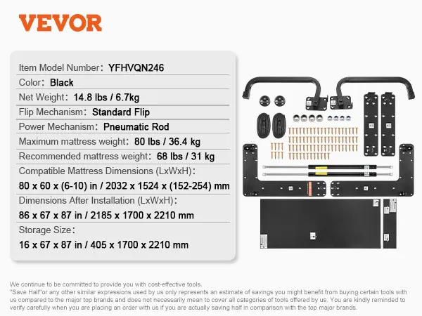 Productspecificaties: Ontworpen voor verticale QUEEN-matrassen, afmetingen: 86 x 67 x 87 inch / 2185 x 1700 x 2210 mm, geschikt voor matrassen van 80 x 60 x (6-10) inch / 2032 x 1524 x (152-254) mm . De draairichting is rechtopstaand, wat een gemakkelijke toegang en efficiënt gebruik van de ruimte in uw slaapkamer mogelijk maakt.