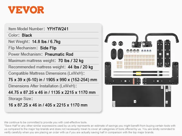 VEVOR Murphy Bed Springs Mechanisme 1135 x 2215 x 1170 mm, Murphy Bed Kit, DIY Kit Mechanische Hardware voor Wandbedden, Pneumatische Hendel Zware Bedondersteuning, Opvouwbare Kast Wandbed