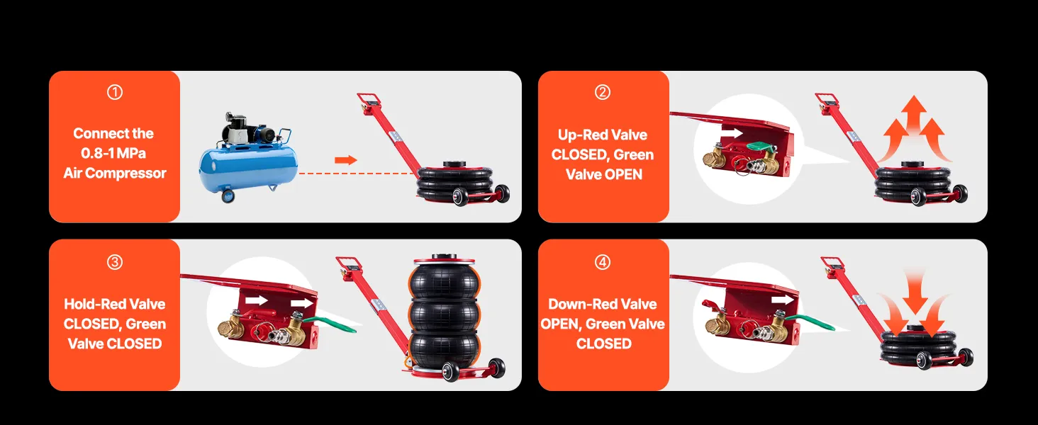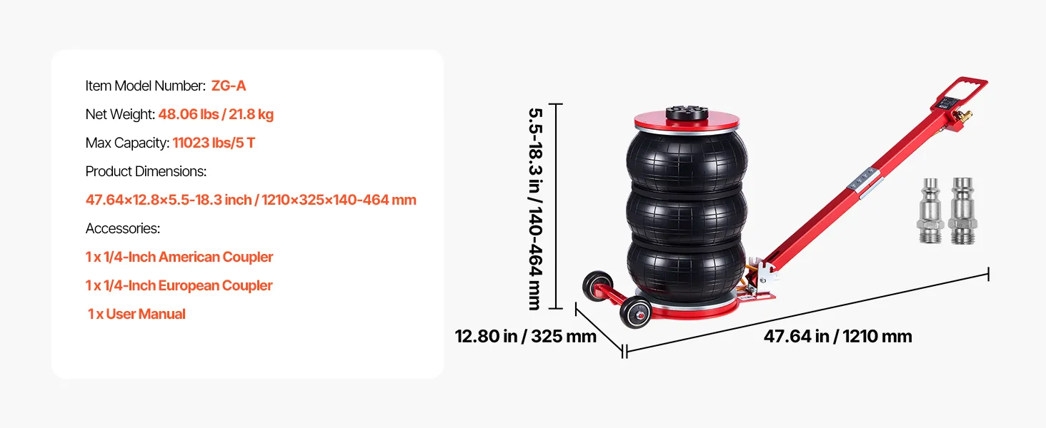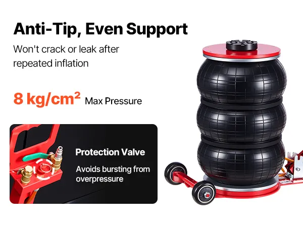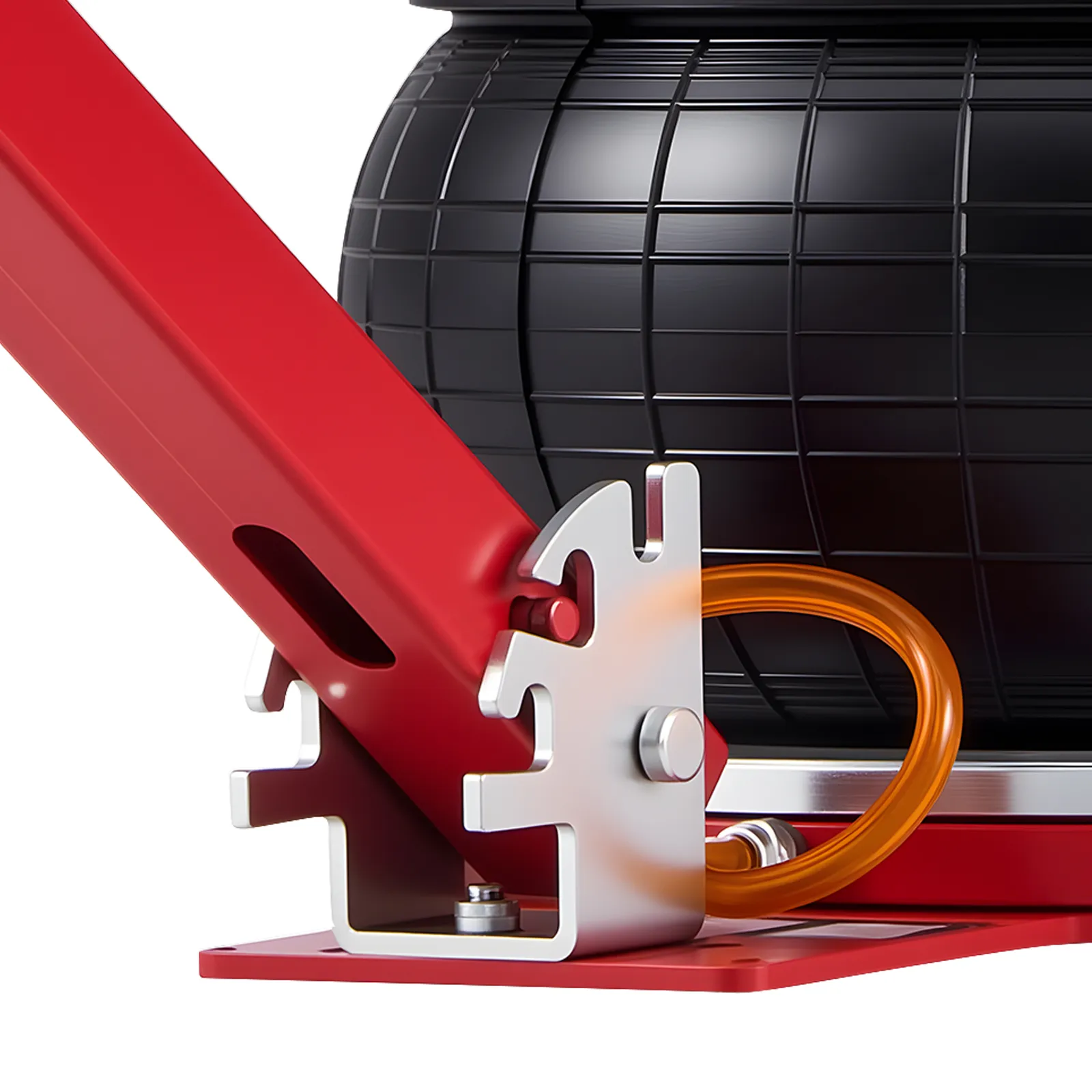Veilige voertuigondersteuning: De bovenkant van de luchtkrik is voorzien van een dikke rubberen pad die stevig op het contactpunt met het voertuig aansluit, waardoor een slipvrije en chassisbeschermende grip gegarandeerd is. Het ventiel wordt geleverd met 1/4-inch koppelingen (VS en EU) en is compatibel met luchtcompressoren van 0,8–1,0 MPa.