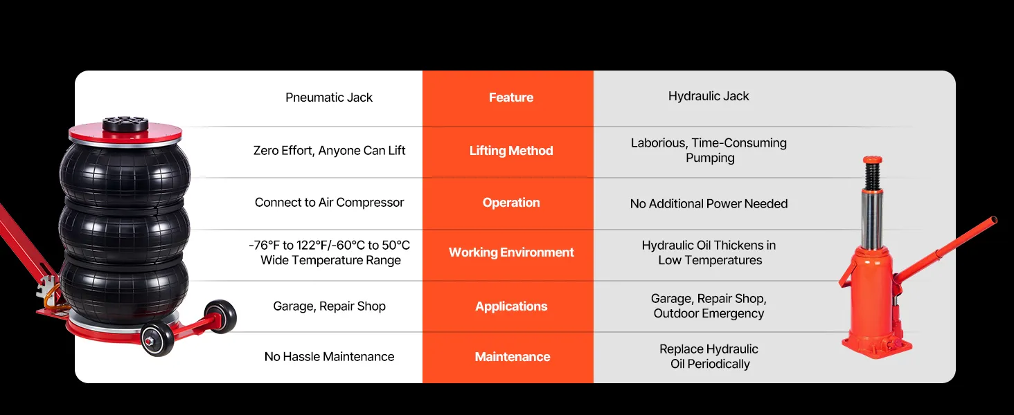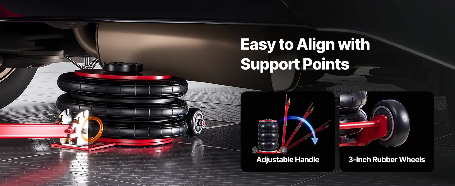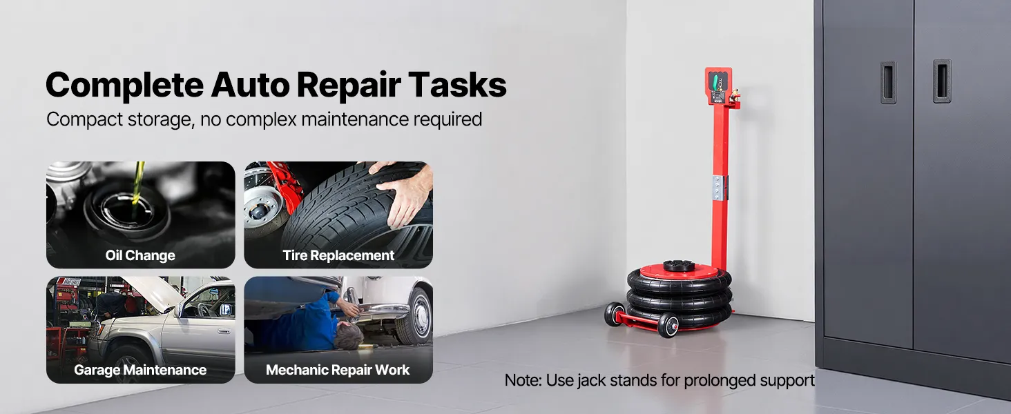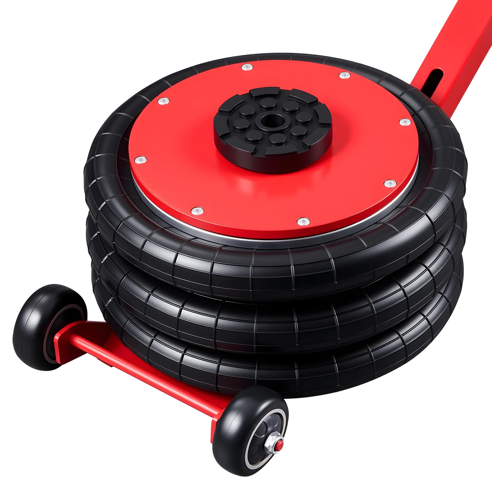 Veilige voertuigondersteuning: De bovenkant van de luchtkrik is voorzien van een dikke rubberen pad die stevig op het contactpunt met het voertuig aansluit, waardoor een slipvrije en chassisbeschermende grip gegarandeerd is. Het ventiel wordt geleverd met 1/4-inch koppelingen (VS en EU) en is compatibel met luchtcompressoren van 0,8–1,0 MPa.